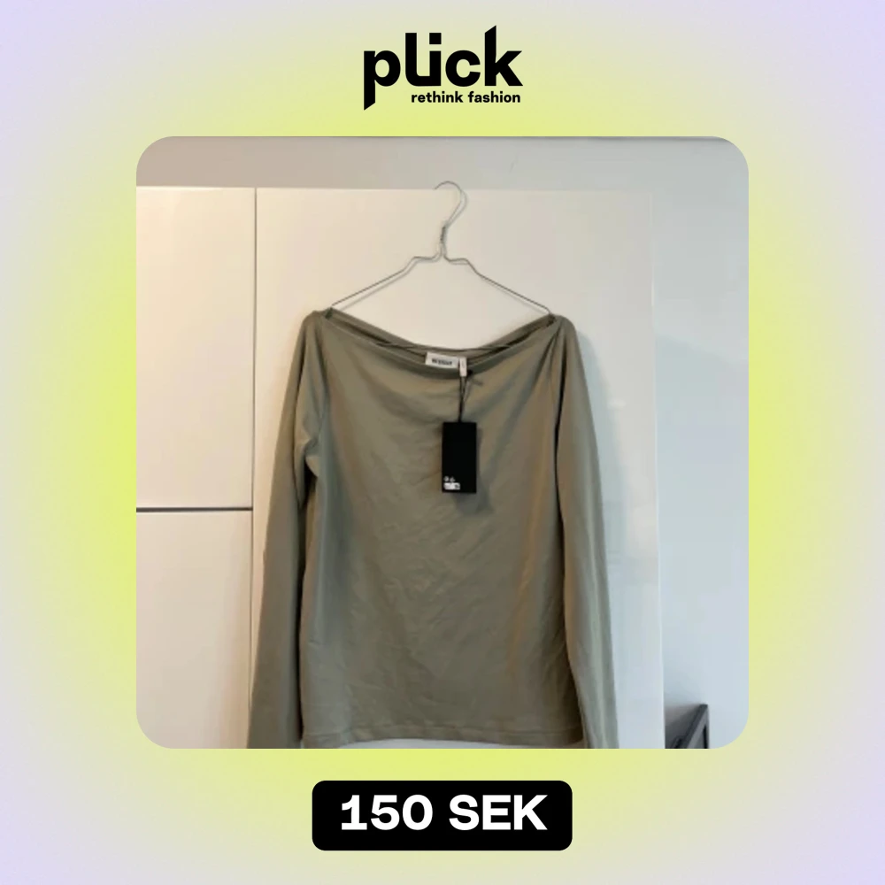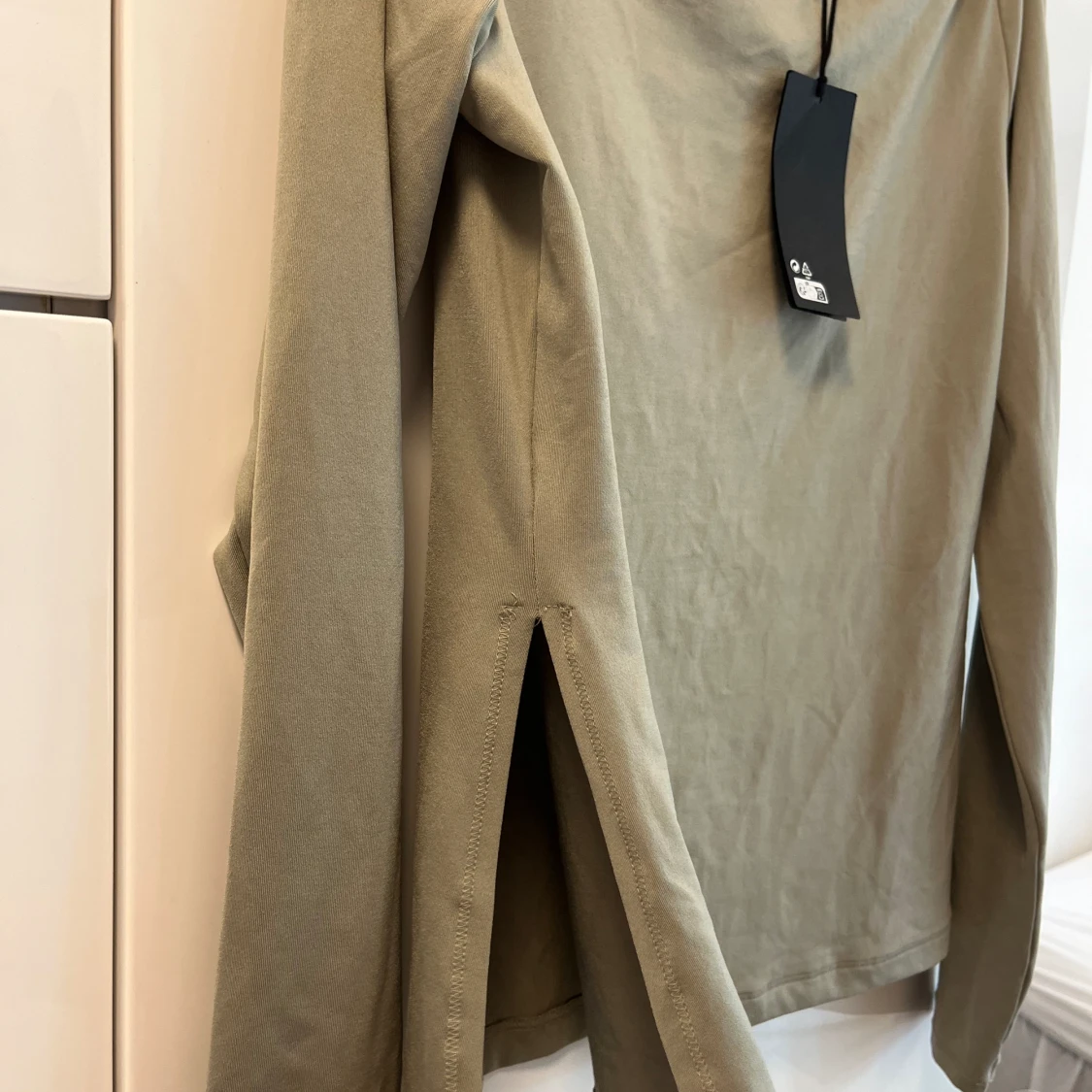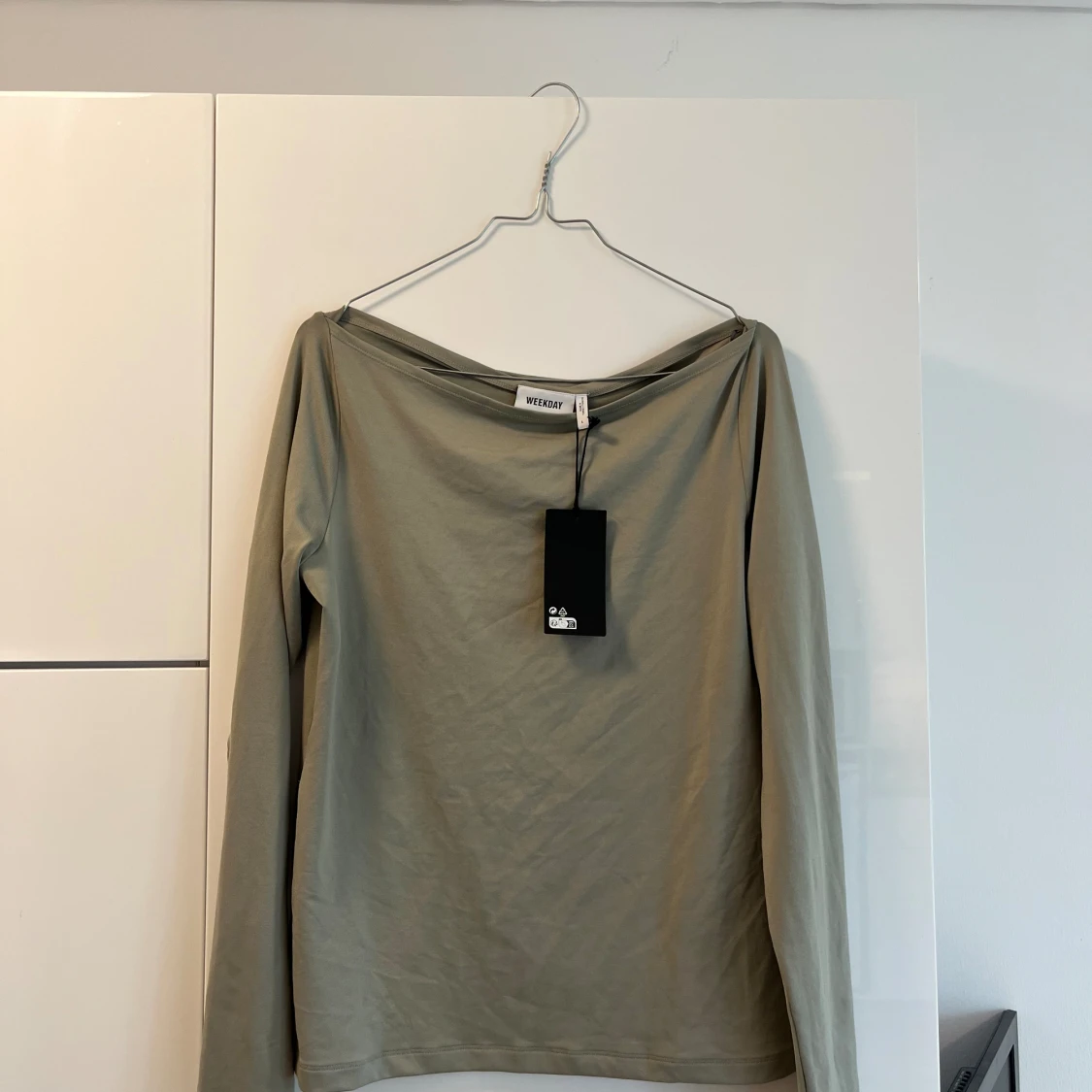 Grön tröja som är tajt, är båtringad i halsen och har en slits på sidan! Aldrig använt