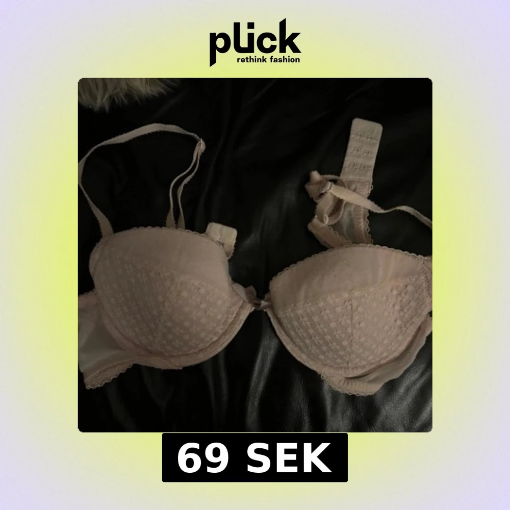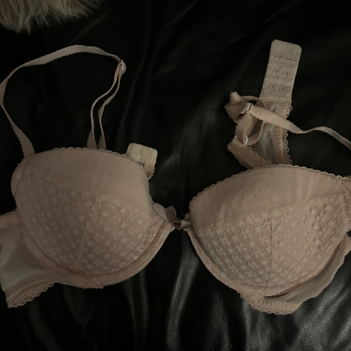 Säljer en elegant beige bh med spetsdetaljer och justerbara axelband. Den har en klassisk design med hakknäppning bak och vadderade kupor för extra komfort.💗