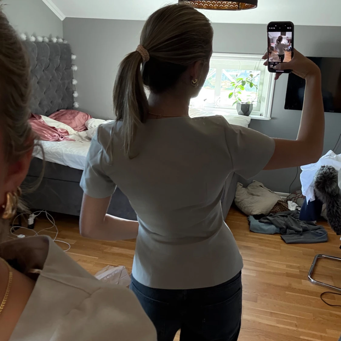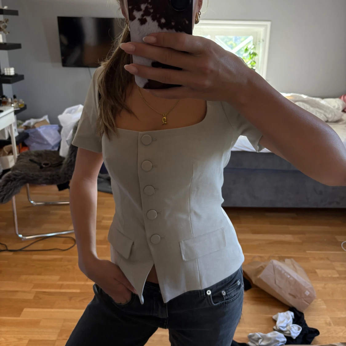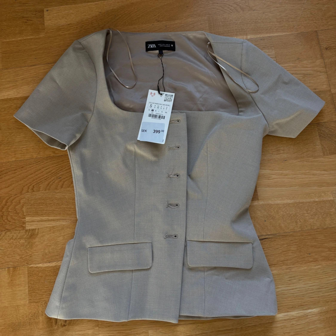 Stilren beige blus från Zara med fyrkantig ringning och korta ärmar. Blusen har stora klädda knappar framtill, två dekorativa fickor och figurnära passform. Perfekt för dig som gillar en clean och modern look.