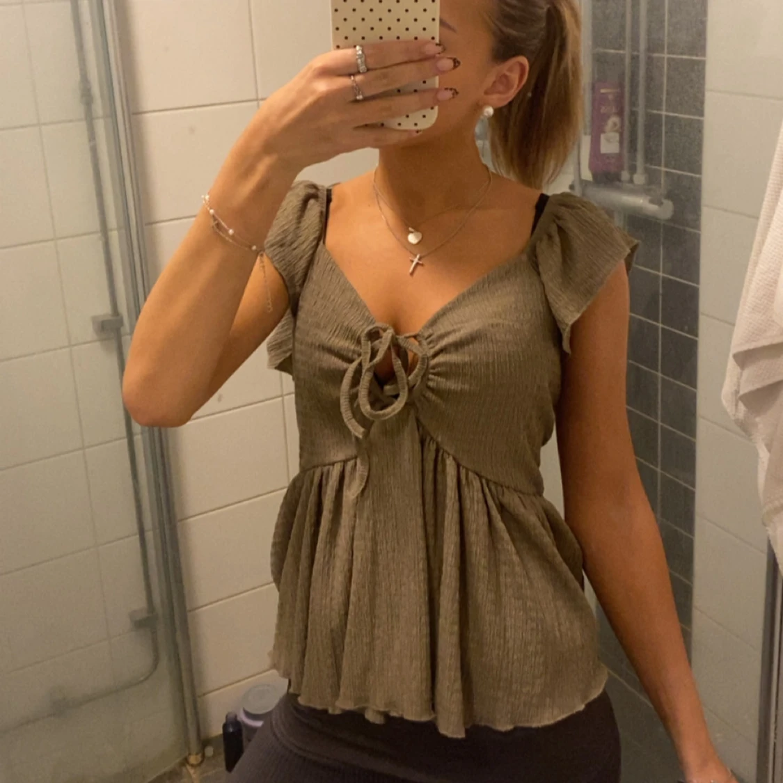 Supersöt beige blus från 157 med volangärmar och knyt framtill. Toppen har v-ringning och ett flowy fall nedtill, perfekt till jeans eller kjol. Materialet är mjukt och lätt, och modellen är normalpassad med ärmlös känsla och fina detaljer. Strl M, men passar mig som vanligtvis har strl XS/S. Säljer då den inte kommer till användning 🩷