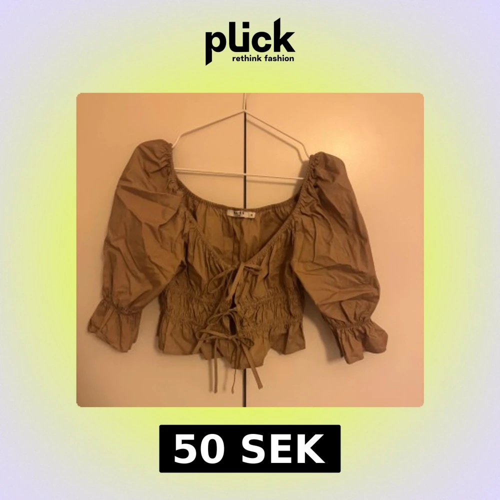 Supersöt beige blus från NA-KD med puffiga trekvartsärmar och snygg snörning framtill. Croppad modell med smock i midjan och volangkant nedtill. Perfekt för dig som gillar romantisk och trendig stil.