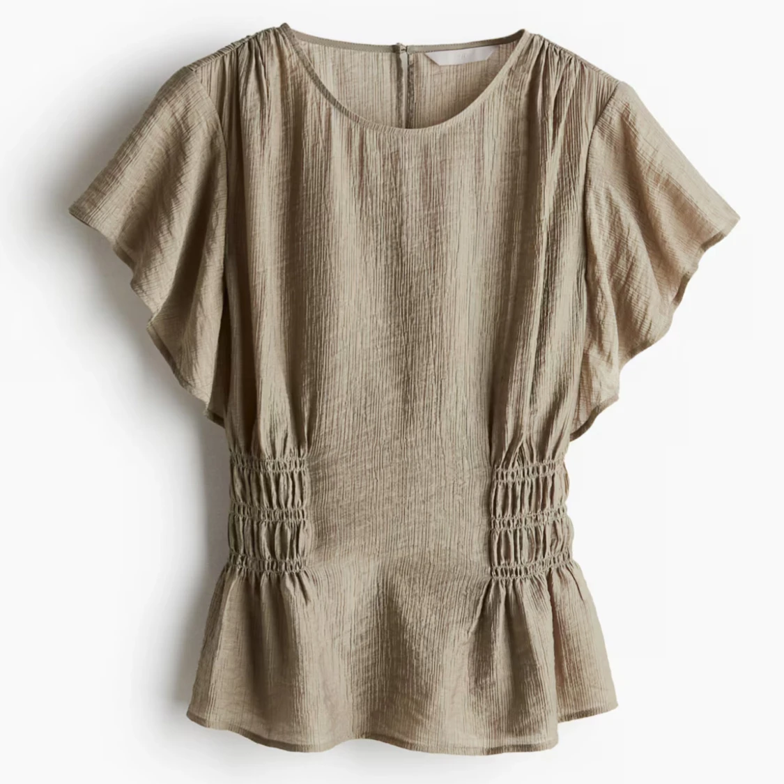 Intressekoll på en beige blus från H&M med korta ärmar och rynkade partier i midjan som ger en snygg siluett. Blusen har rund halsringning och lätt volang nedtill. Den är i nyskick med lappen kvar.
