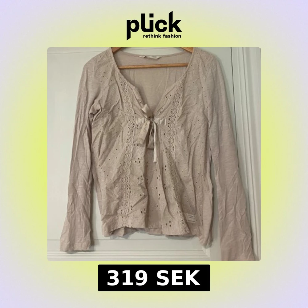 Supersöt beige blus från Odd Molly med broderade blommor, spetsdetaljer och v-ringning. Långärmad modell med knytband framtill och fina hålbroderier.