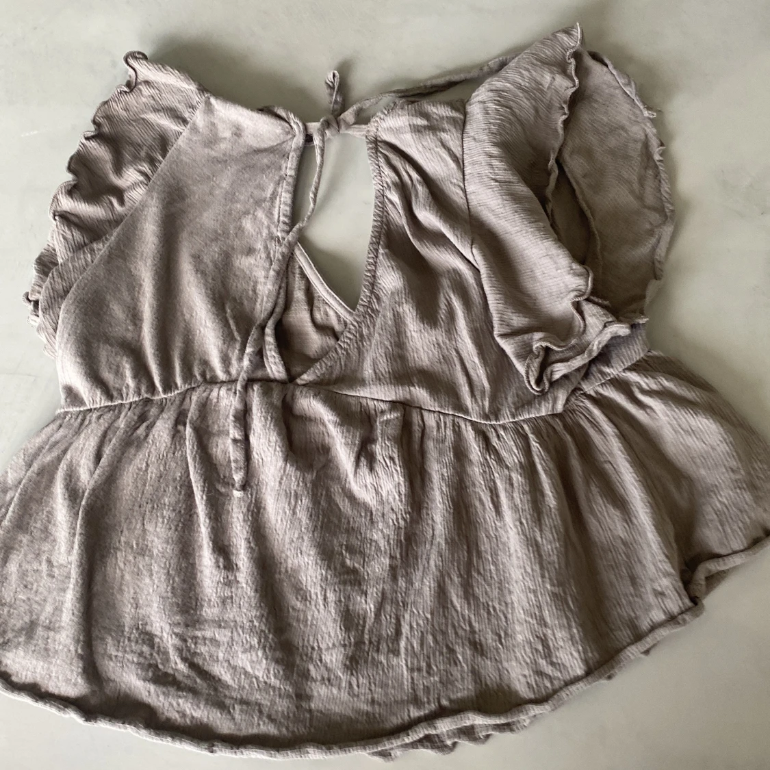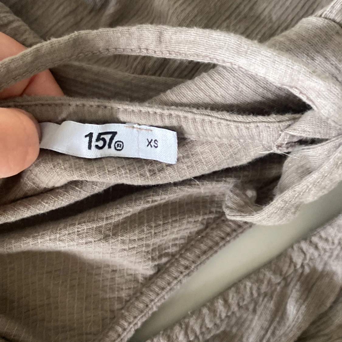 Supersöt beige blus från 157 i storlek XS. Den har korta volangärmar, v-ringning och knytning i nacken. Blusen är luftig med lätt rynk vid midjan och har en flowy, avslappnad passform. Perfekt för dig som gillar en romantisk och chill stil.