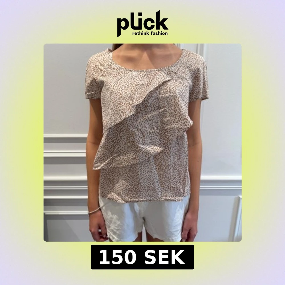 Säljer en söt beige blus med ett diskret prickigt mönster och volangdetalj framtill. Blusen har korta ärmar och en rund halsringning. Perfekt för en stilren och chic look.