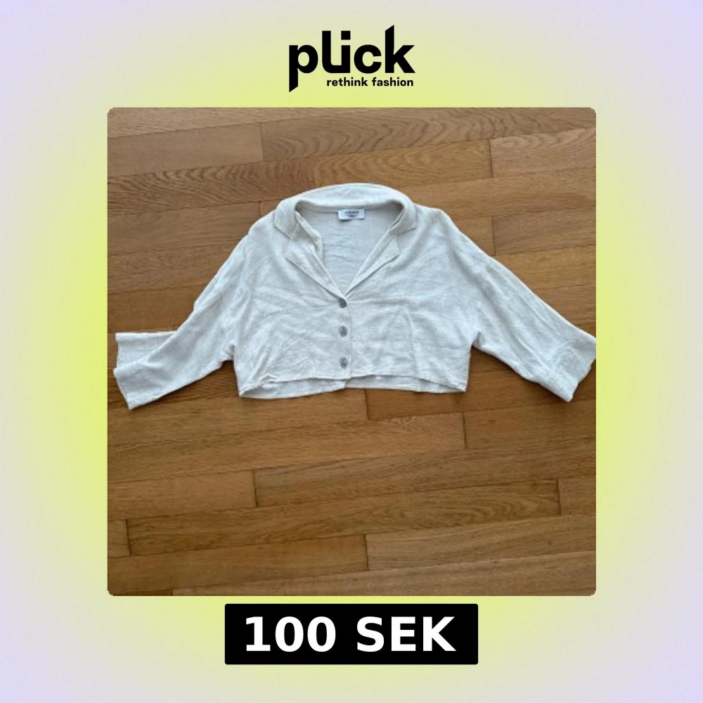 Superfin croppad topp i beige linne. Modellen har tre knappar framtill, krage och vida trekvartsärmar. Perfekt för en chill och avslappnad look med en touch av vintagekänsla.