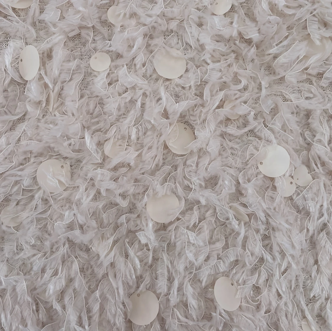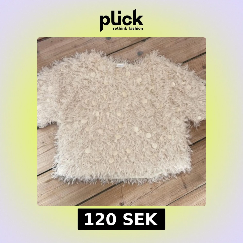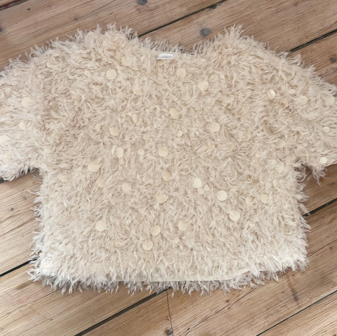 Supercool fluffig topp från Zara i beige med kort ärm. Toppen är täckt av stora, runda paljetter som ger en unik och festlig look. Materialet är syntetiskt och har en lurvig, nästan pälsliknande känsla. Perfekt för dig som vill sticka ut med en statement-piece!