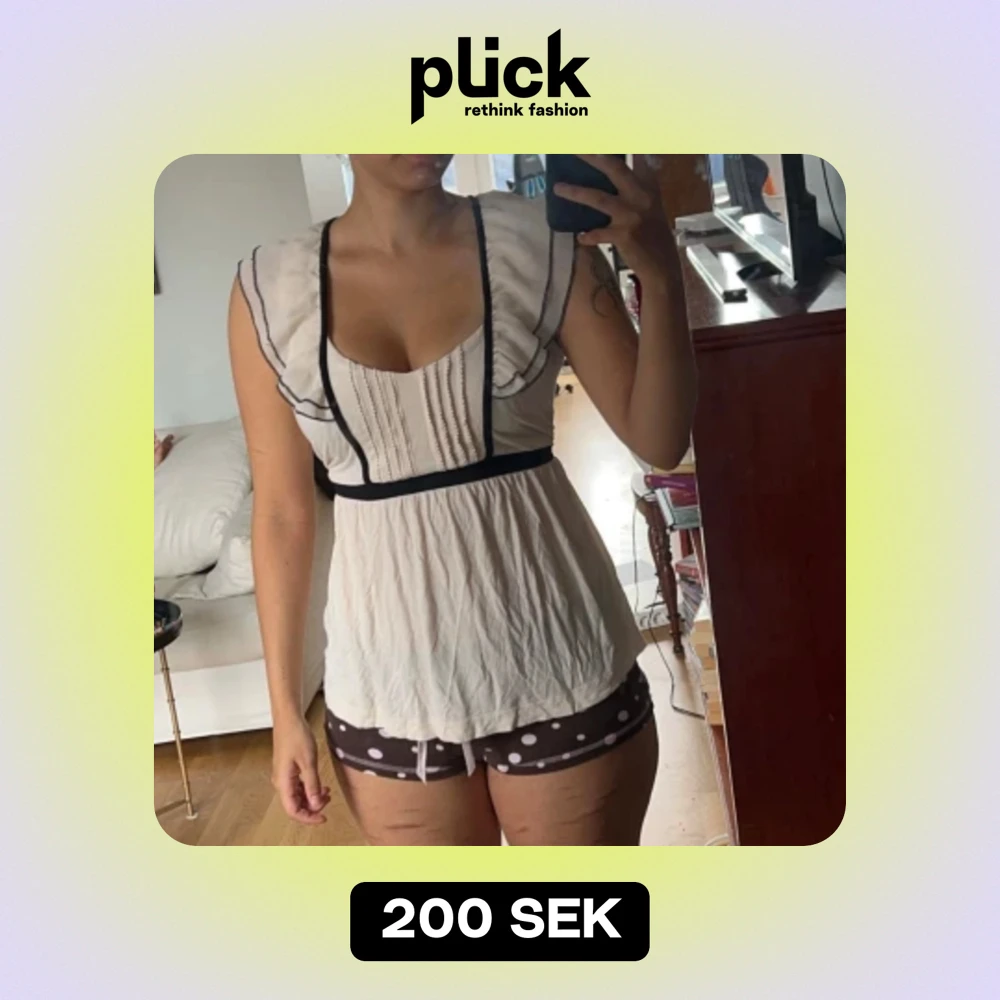 Säljer en söt beige topp från H&M med svarta detaljer. Toppen har volangärmar och en tight passform med knytband i midjan. Perfekt för sommaren eller en festlig kväll! 🖤(står L men passar mig som har S/M