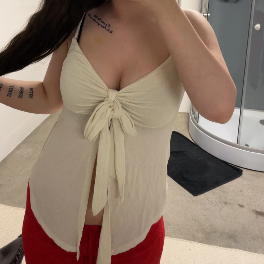 Säljer ett beige linne med v-ringning och knyt framtill. Toppen är ärmlös och har en lös passform, perfekt för varma dagar. Materialet känns lätt och luftigt. Har endast testats!