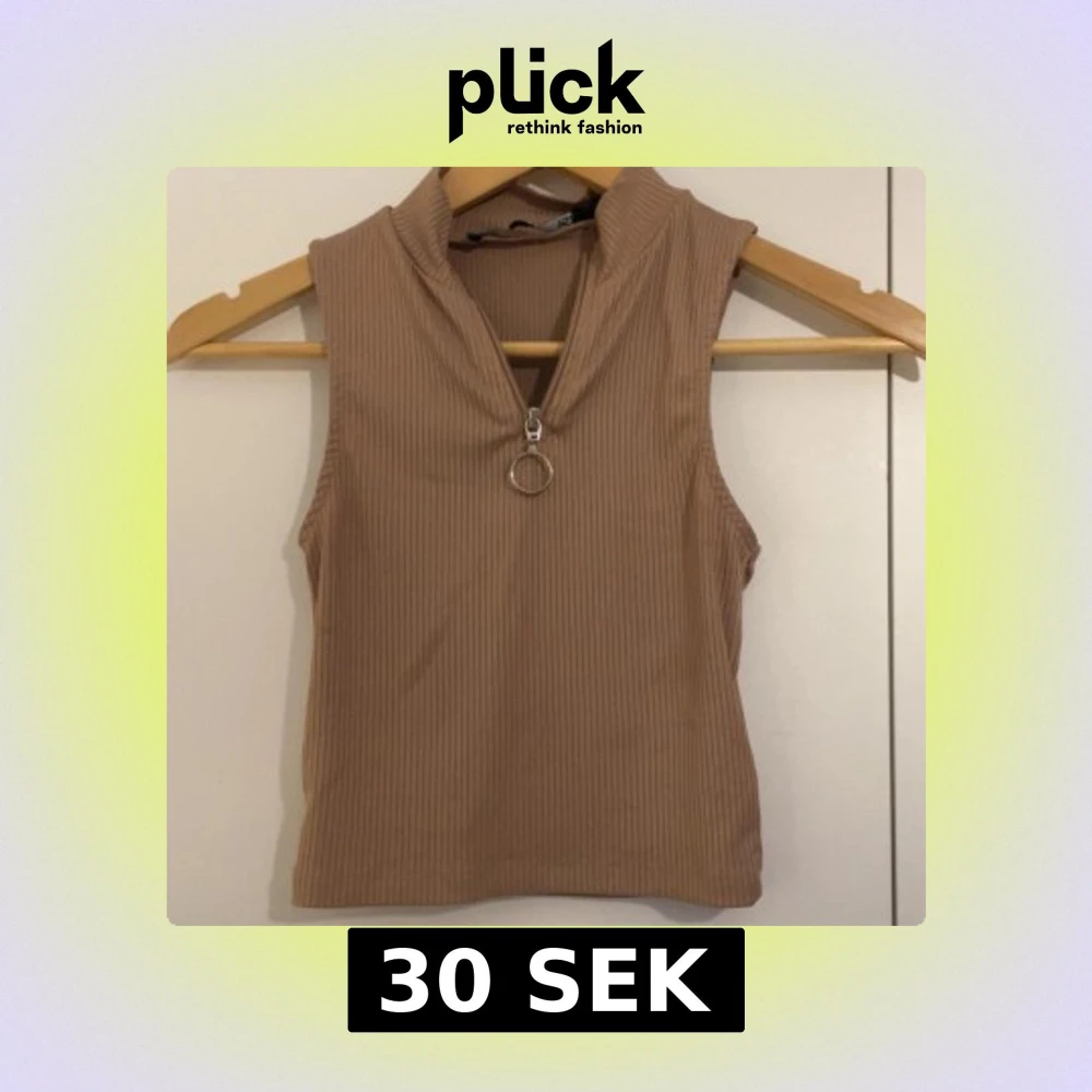 Säljer en beige ribbad ärmlös topp med hög krage och snygg dragkedja framtill med rund metallring. Perfekt för en trendig och avslappnad look. Passar till både jeans och kjol.