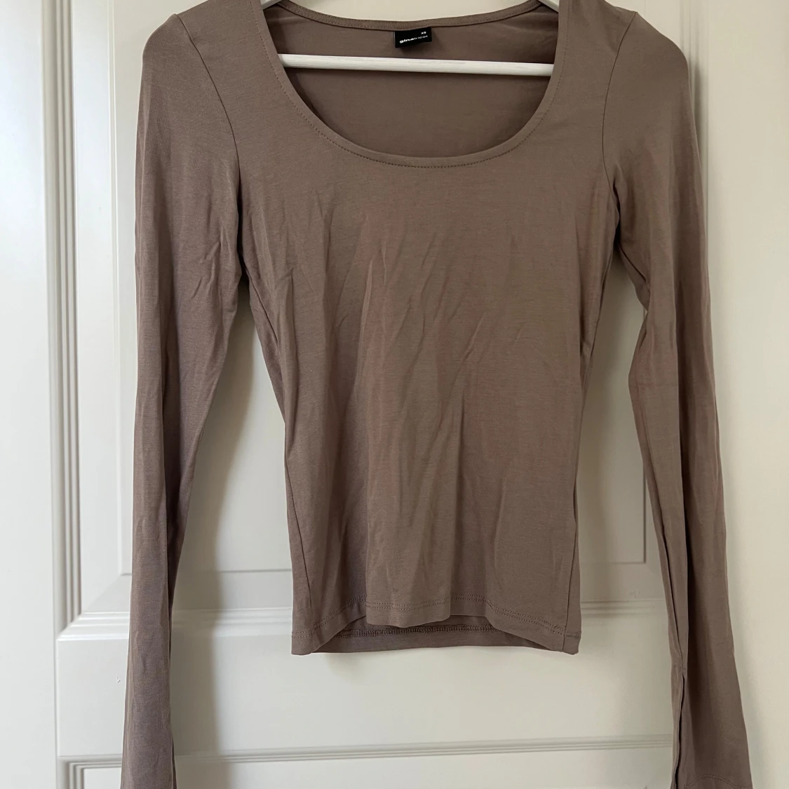 Supermjuk och stretchig beige topp från Monki med lång ärm och rundad urringning. Ärmarna har en liten slits vid ärmslutet som ger en extra detalj. Perfekt att styla med jeans eller kjol för en clean look.