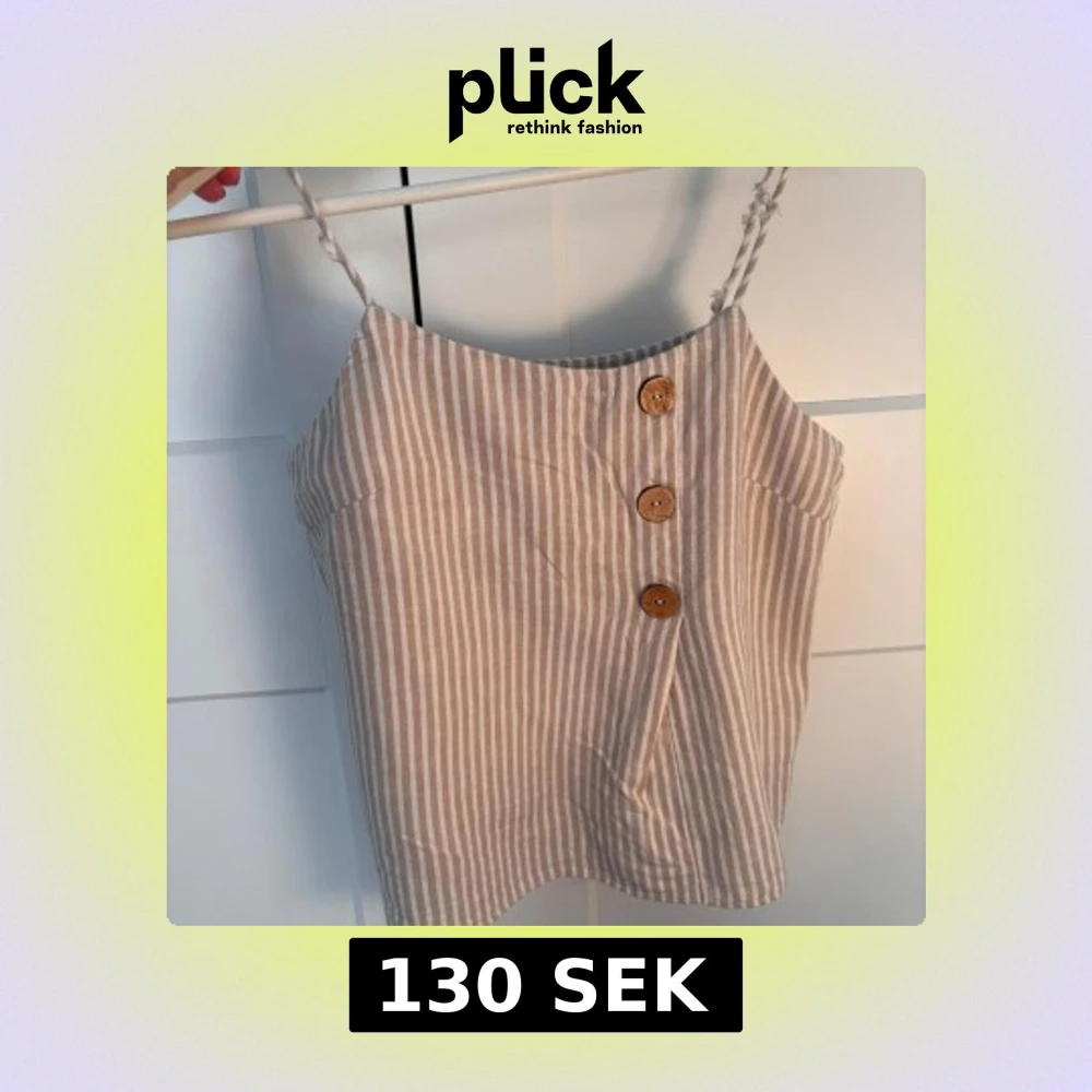 Säljer en beige och vit randig linnetopp med smala axelband och tre snygga träknappar framtill. Toppen har en rak passform och är perfekt för varma dagar.