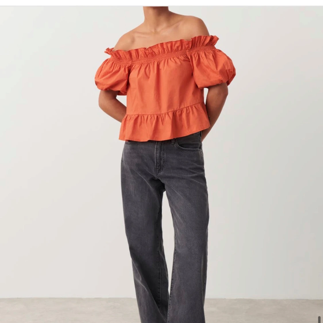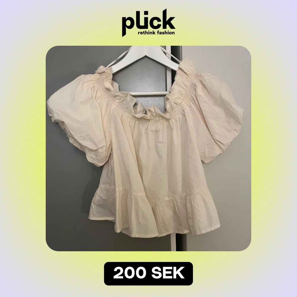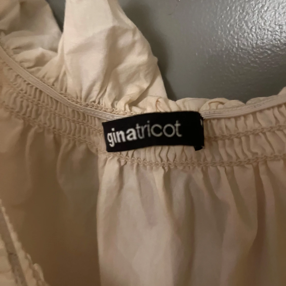 Säljer en superfin beige offshoulder topp från Gina Tricot. Den har puffiga korta ärmar och en volangdetalj vid halsen. På bild 3 ser man toppen på fast i en annan färg. Använd 1 gång