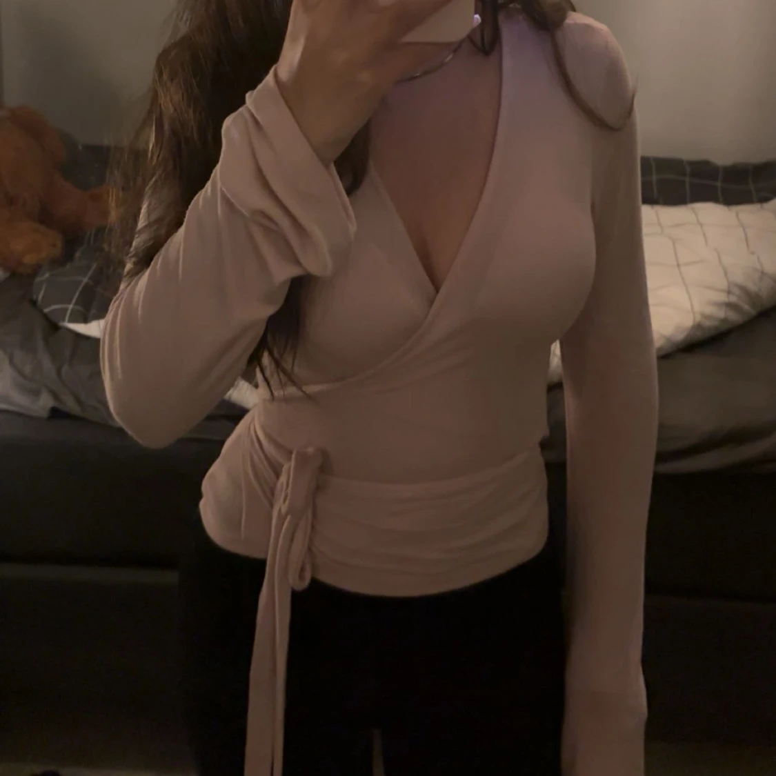 Supersnygg beige omlottopp från Gina Tricot med långa ärmar och knyt i midjan. Toppen har v-ringning och sitter figurnära, perfekt för dig som gillar en stilren och trendig look.