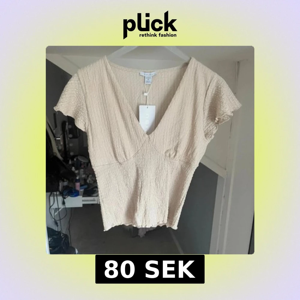 Supersöt beige topp från MISU med omlott-look och v-ringning. Toppen har korta, lite fladdriga ärmar och är gjord i ett krinklat, lätt material som känns luftigt. Perfekt för varma dagar och enkel att styla med jeans eller kjol.