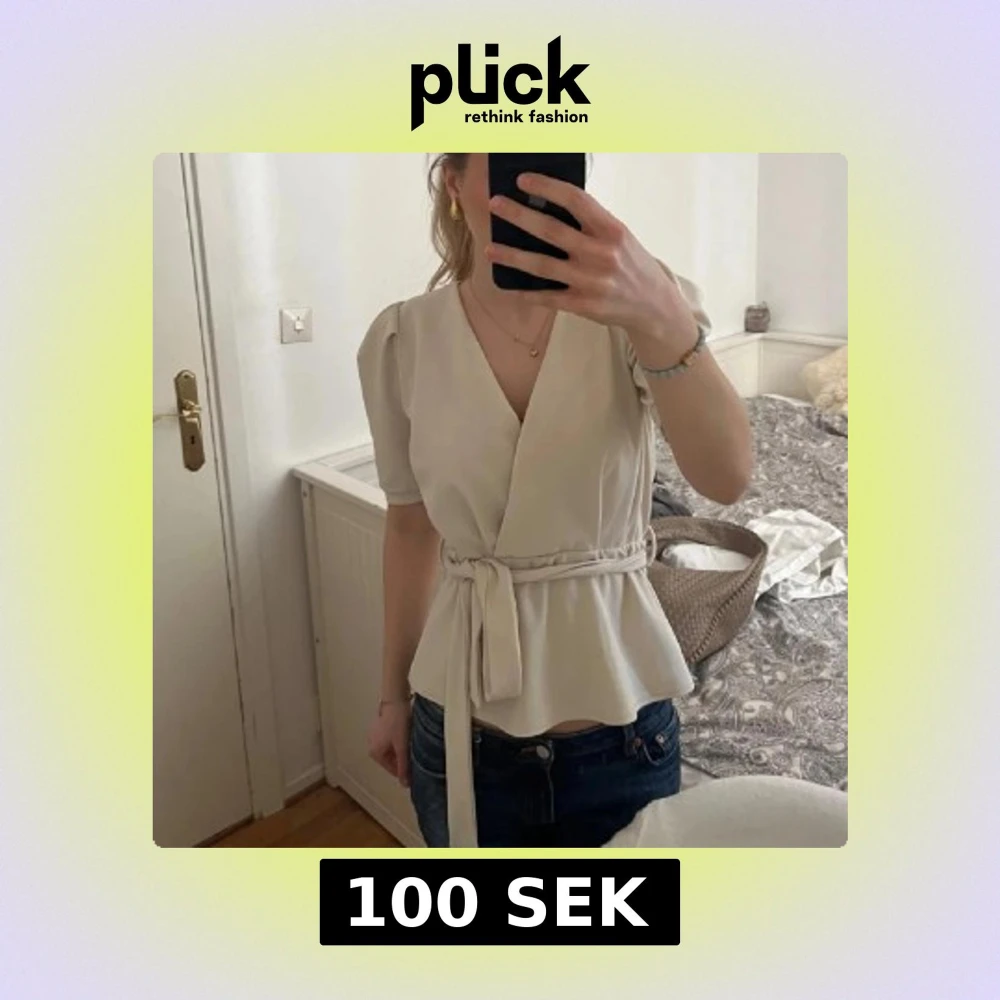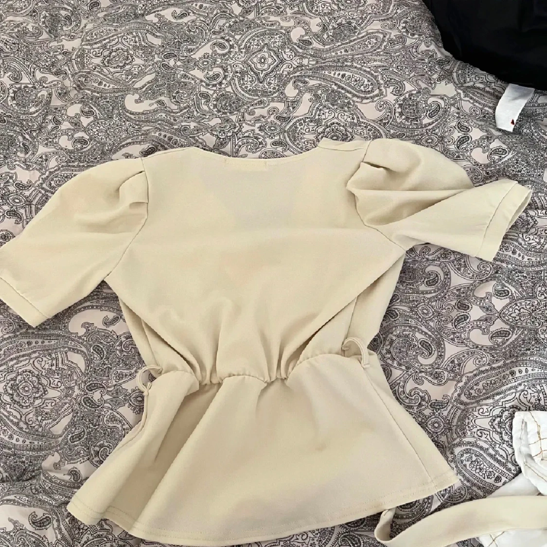 Säljer en beige omlottopp från NA-KD med kort puffärm och knytband i midjan. Toppen har v-ringning och markerad midja som ger en fin siluett. Perfekt till jeans eller kjol för en stilren look.