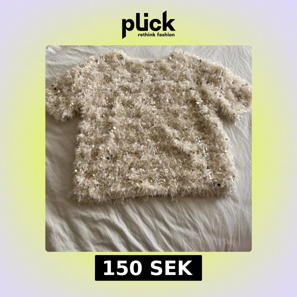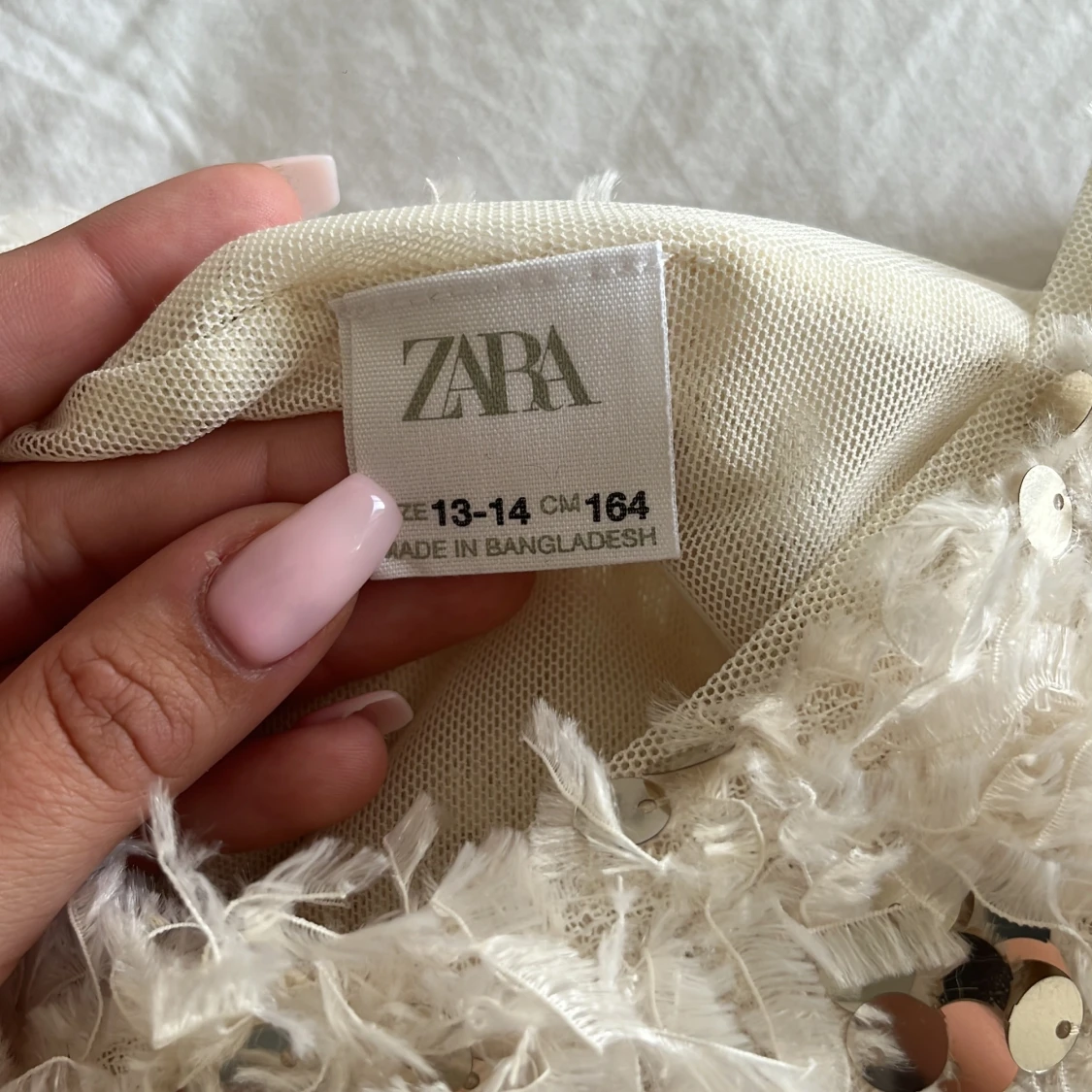 Superfin beige topp från Zara med korta ärmar, täckt av fluffiga detaljer och glittrande paljetter. Ger en riktigt cool och unik look med sin textur och skimrande yta. Perfekt för dig som vill sticka ut och älskar statement-plagg.