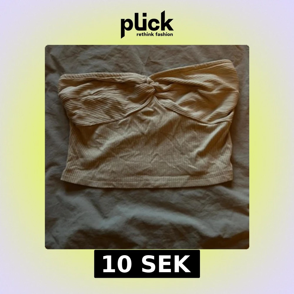 Säljer en beige bandeau tubtopp med ribbad struktur och snygg twistdetalj framtill. Toppen är axelbandslös och har en croppad passform som passar perfekt till höga jeans eller kjol.