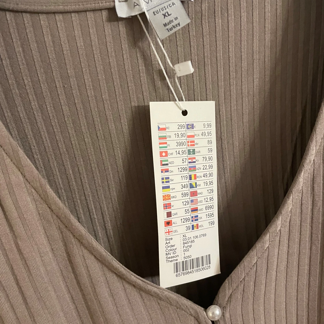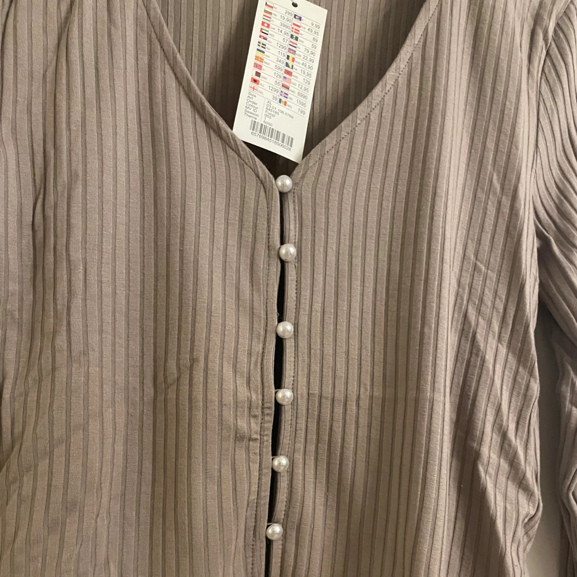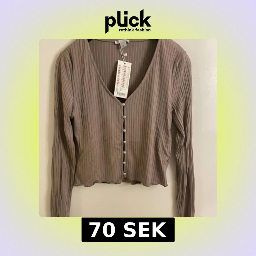 Säljer en beige ribbad blus från Amisu i storlek XL. Blusen har lång ärm, v-ringning och är croppad i modellen. Framtill sitter dekorativa pärlknappar som ger en extra touch. Materialet är mjukt och lätt, perfekt för dig som gillar stilrena detaljer.