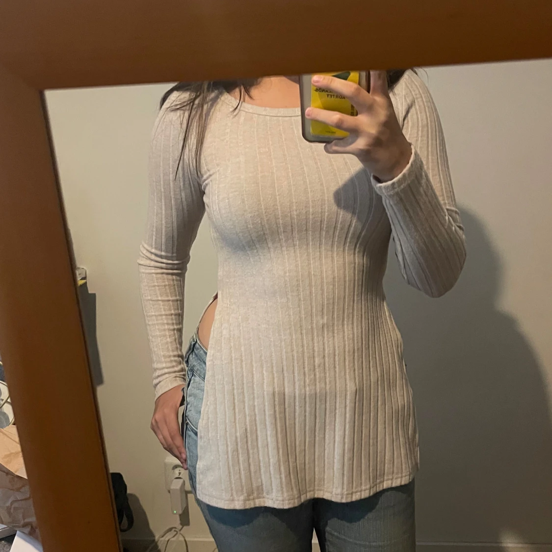 Säljer en beige ribbad långärmad topp med rund hals och slim fit. Toppen har slitsar på sidorna. Materialet är mjukt och stretchigt, vilket gör den skön att bära hela dagen. Passar fint med svarta eller beiga byxor. Säljer då den är för tight för mig