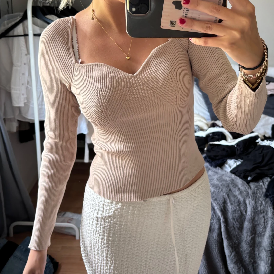 Supersnygg beige ribbad topp med lång ärm och markerad byst. Snygg sweetheart-urringning och figurnära passform som framhäver siluetten. Perfekt att styla med kjol eller jeans för en trendig look.