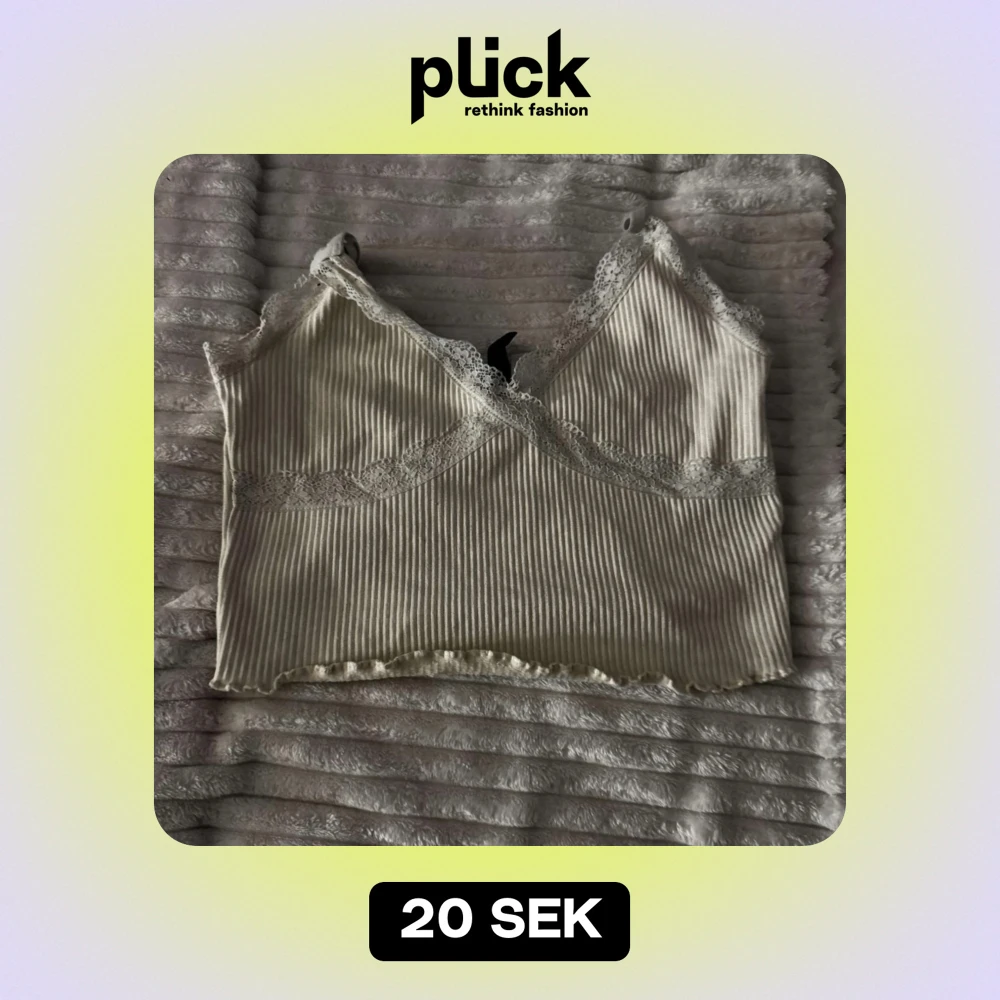 Säljer en söt beige ribbad linne med spetsdetaljer vid halsringningen och axelbanden. Toppen är croppad och har en omlott-design framtill. Perfekt för varma dagar eller som ett lager under en tröja. ⚠️ ni betalar för frakt