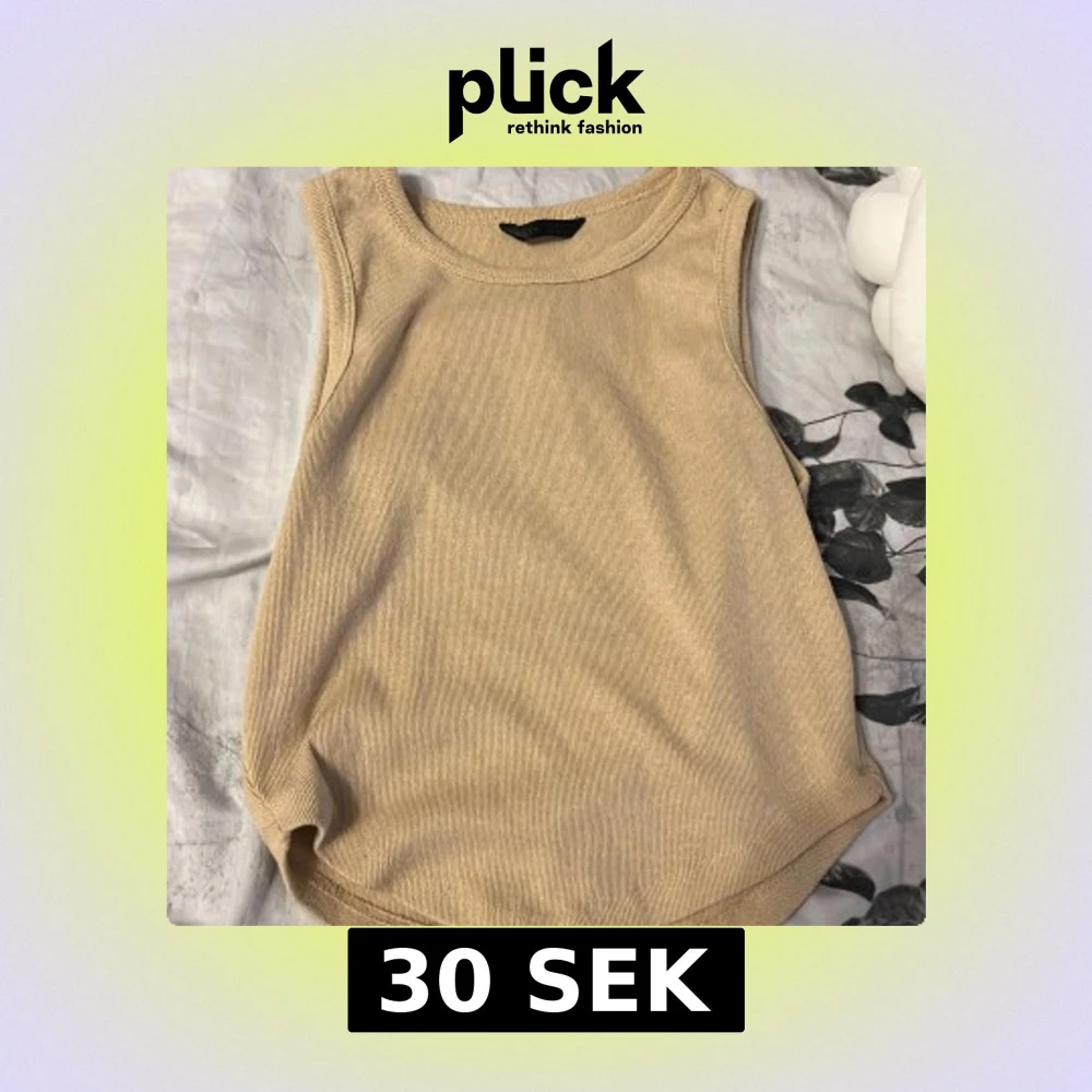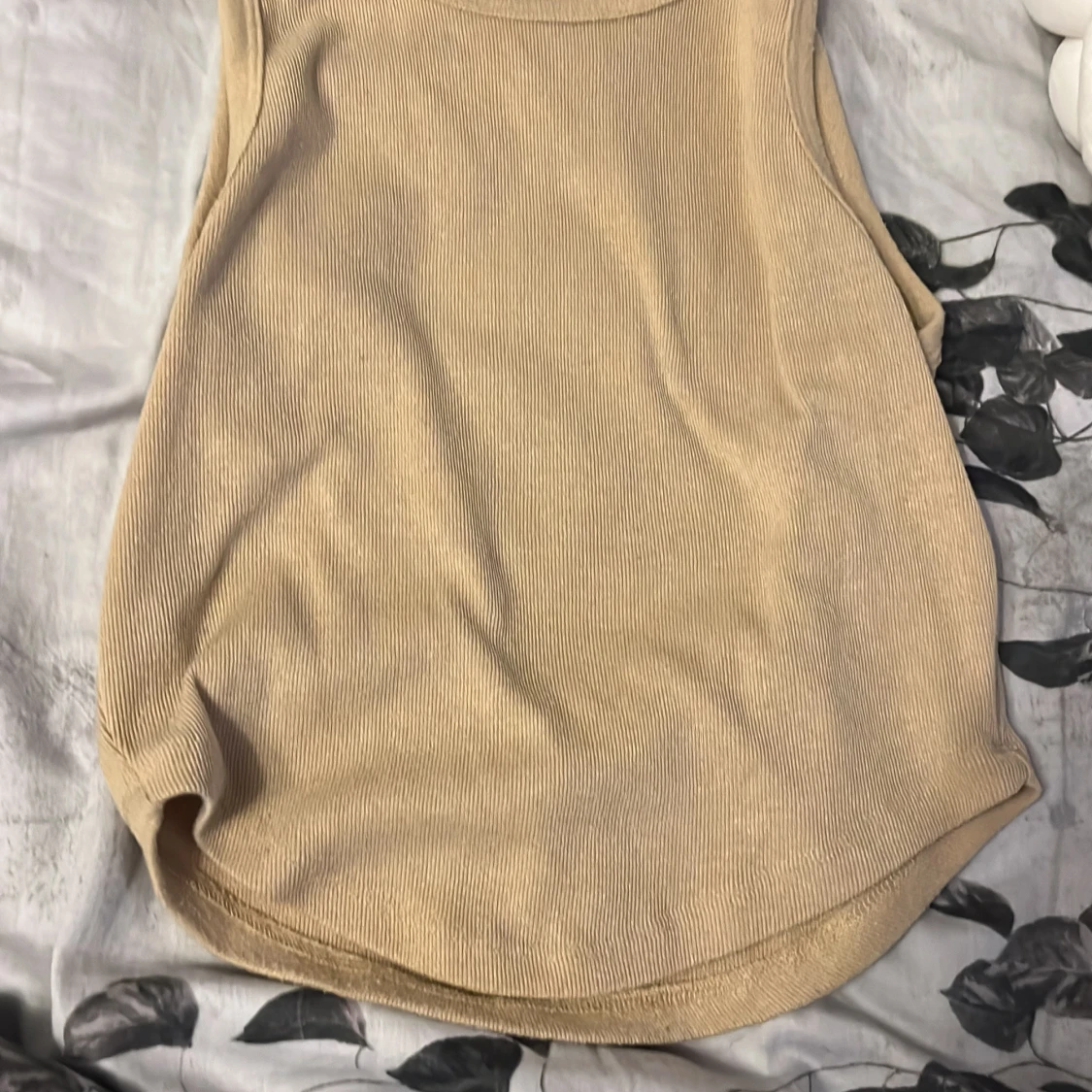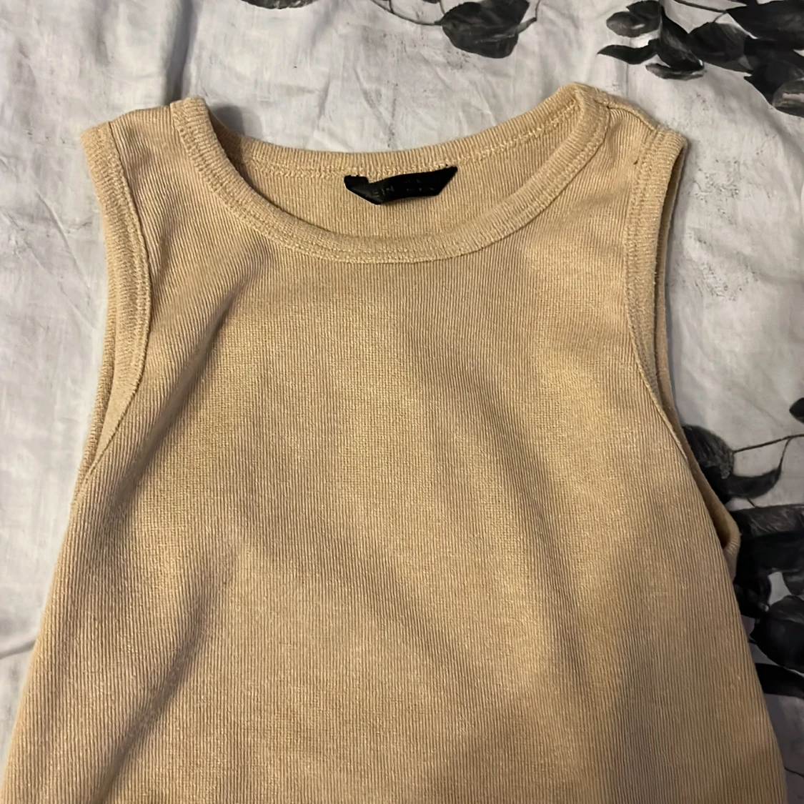 En stilren beige linnetopp från H&M i ribbat material. Toppen är ärmlös med rund halsringning och har en mjuk, stretchig känsla. Perfekt att matcha med jeans eller kjol för en enkel och snygg look.