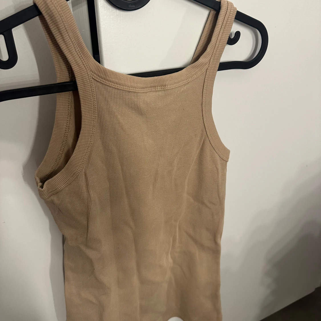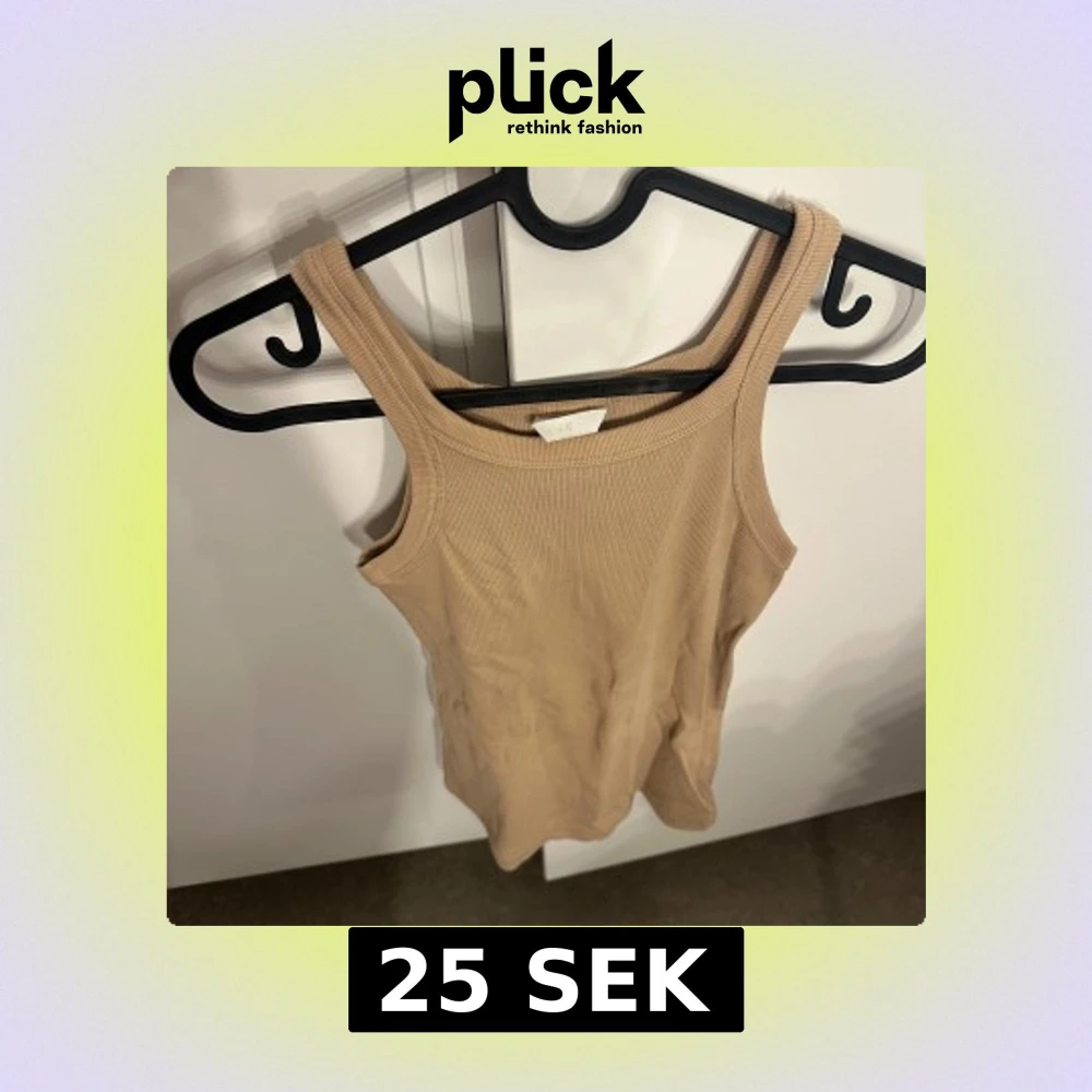 Säljer en beige ribbad linnetopp från H&M i storlek M. Toppen har breda axelband och är tillverkad i mjuk bomull med stretch. Perfekt att styla med jeans eller kjol för en enkel och clean look.