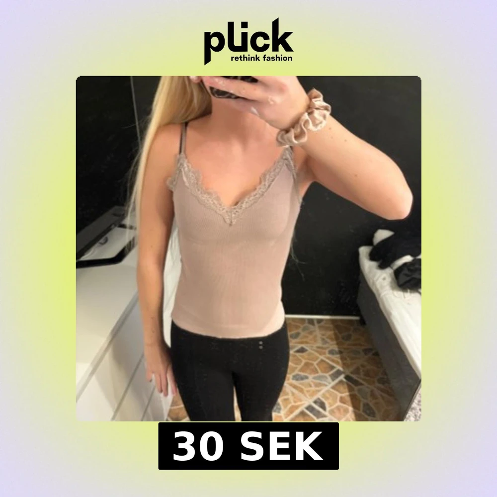 Säljer en stilren beige ribbad linnetopp med vacker spetskant vid den v-ringade halsen. Toppen har smala axelband och en tight passform, perfekt för en chic och bekväm look.