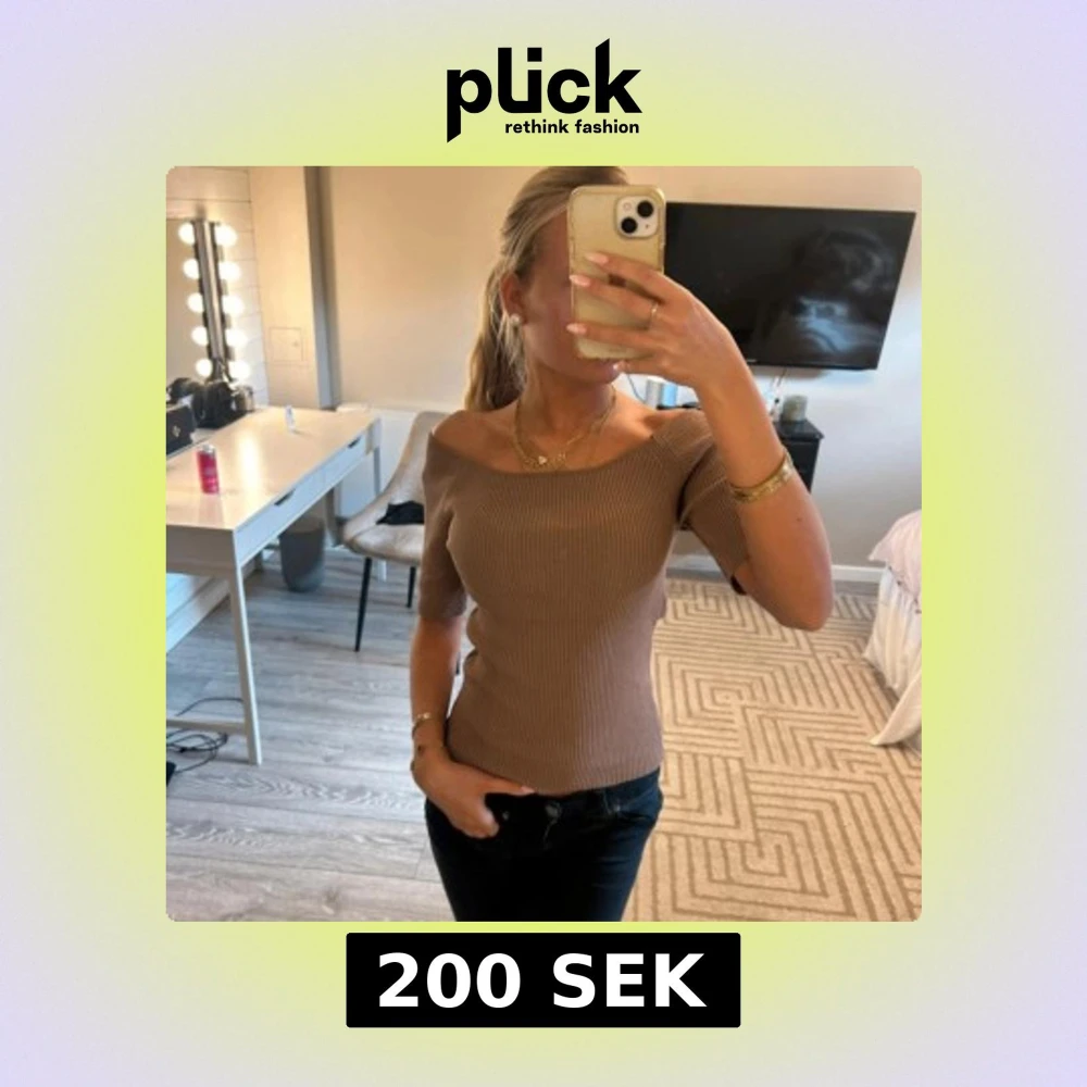 Säljer en beige ribbad topp med offshoulder och korta ärmar. Snygg, figurnära passform som framhäver axlarna. Materialet är mjukt och stretchigt, perfekt för dig som gillar en clean och stilren look. Passar dig som vill ha en enkel men trendig topp.