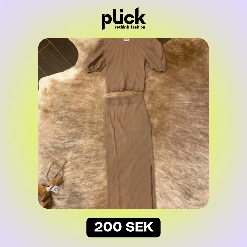 Säljer en superfin beige ribbad topp med trekvartsärm. Den är croppad och har en rund halsringning. Perfekt för både vardag och fest! ribbad kjol (sett)