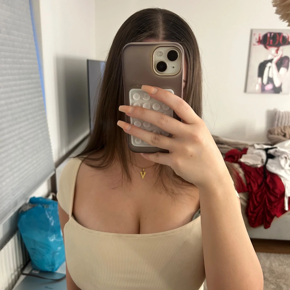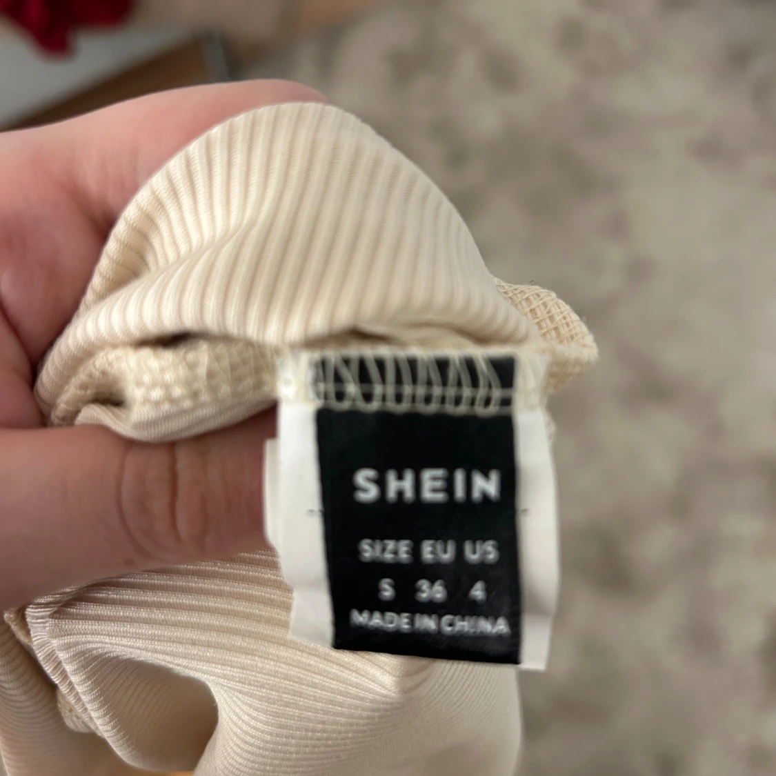 Säljer en beige ribbad topp från SHEIN i storlek S. Toppen har breda axelband och en fyrkantig urringning som ger en snygg och modern look. Perfekt att matcha med jeans eller kjol för en trendig outfit. Den är kort.