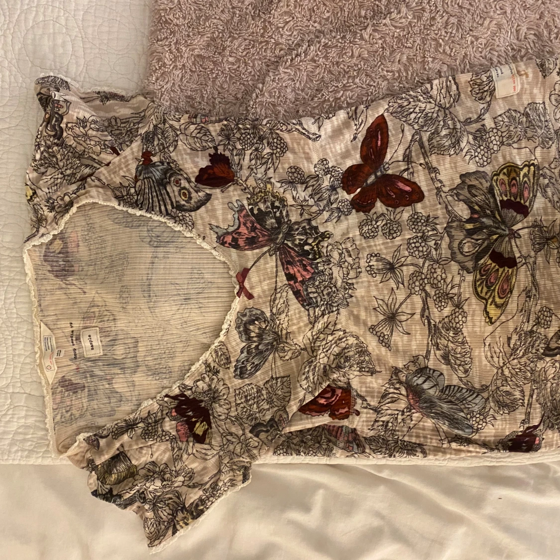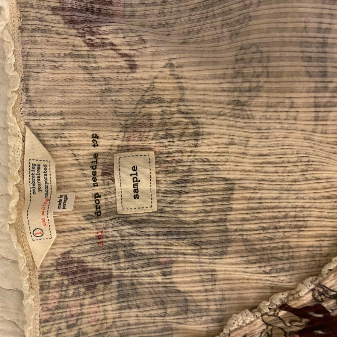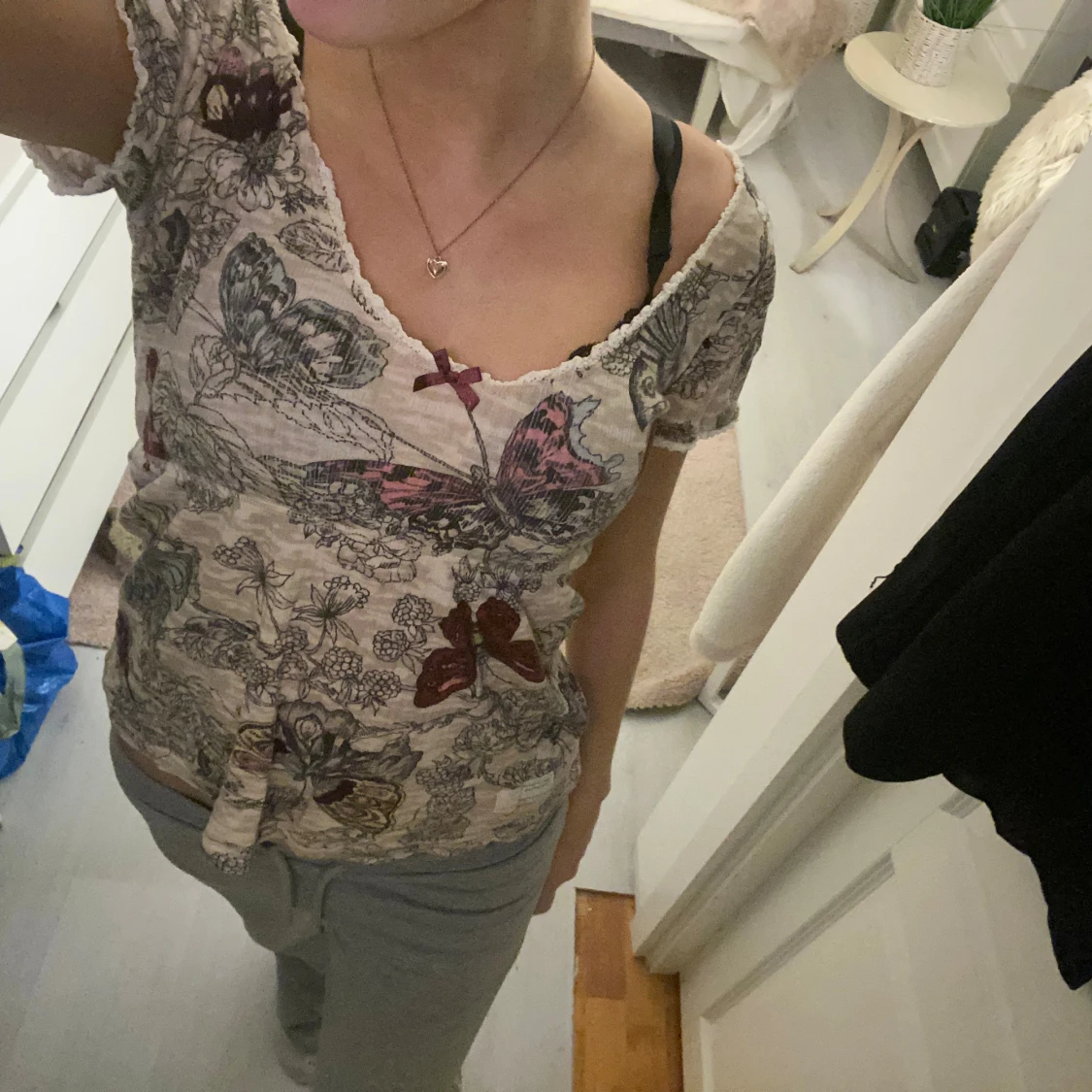 Superfin beige ribbad topp från Odd Molly med v-ringning och spetskant. Toppen har ett detaljerat fjärilsmönster i rött, lila och brunt samt blommor över hela tyget. Kortärmad och figurnära passform, perfekt för dig som gillar unika prints.