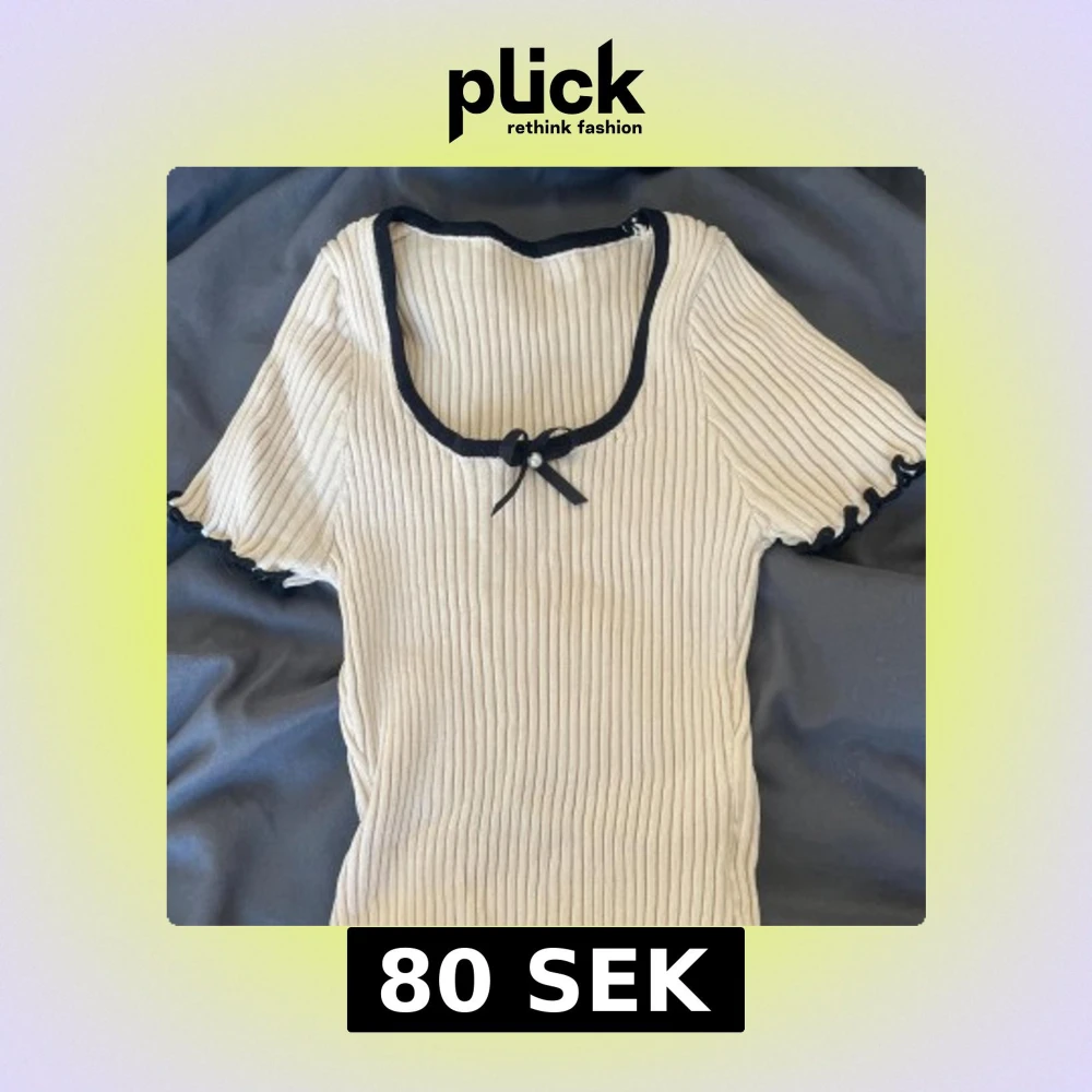 Supersöt croppad topp i beige ribbat material med svarta detaljer längs kanterna och en liten rosett med pärla vid urringningen. Toppen har korta ärmar med vågig kant och sitter tight. Perfekt för dig som gillar en söt och trendig stil.