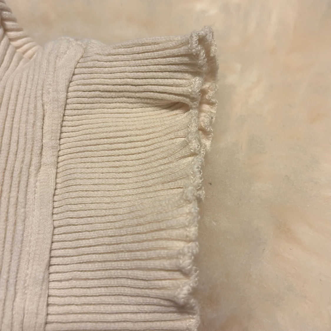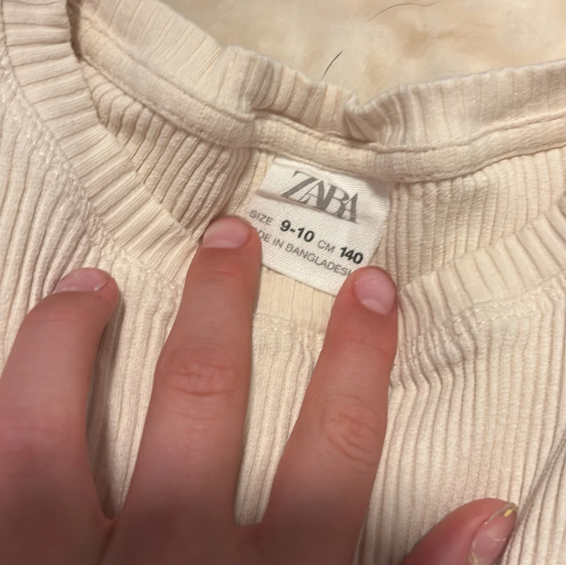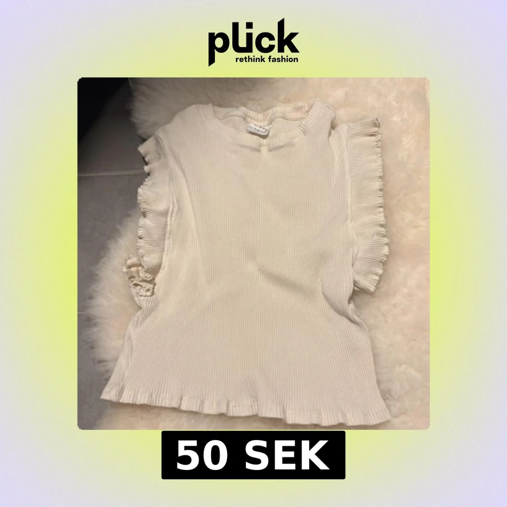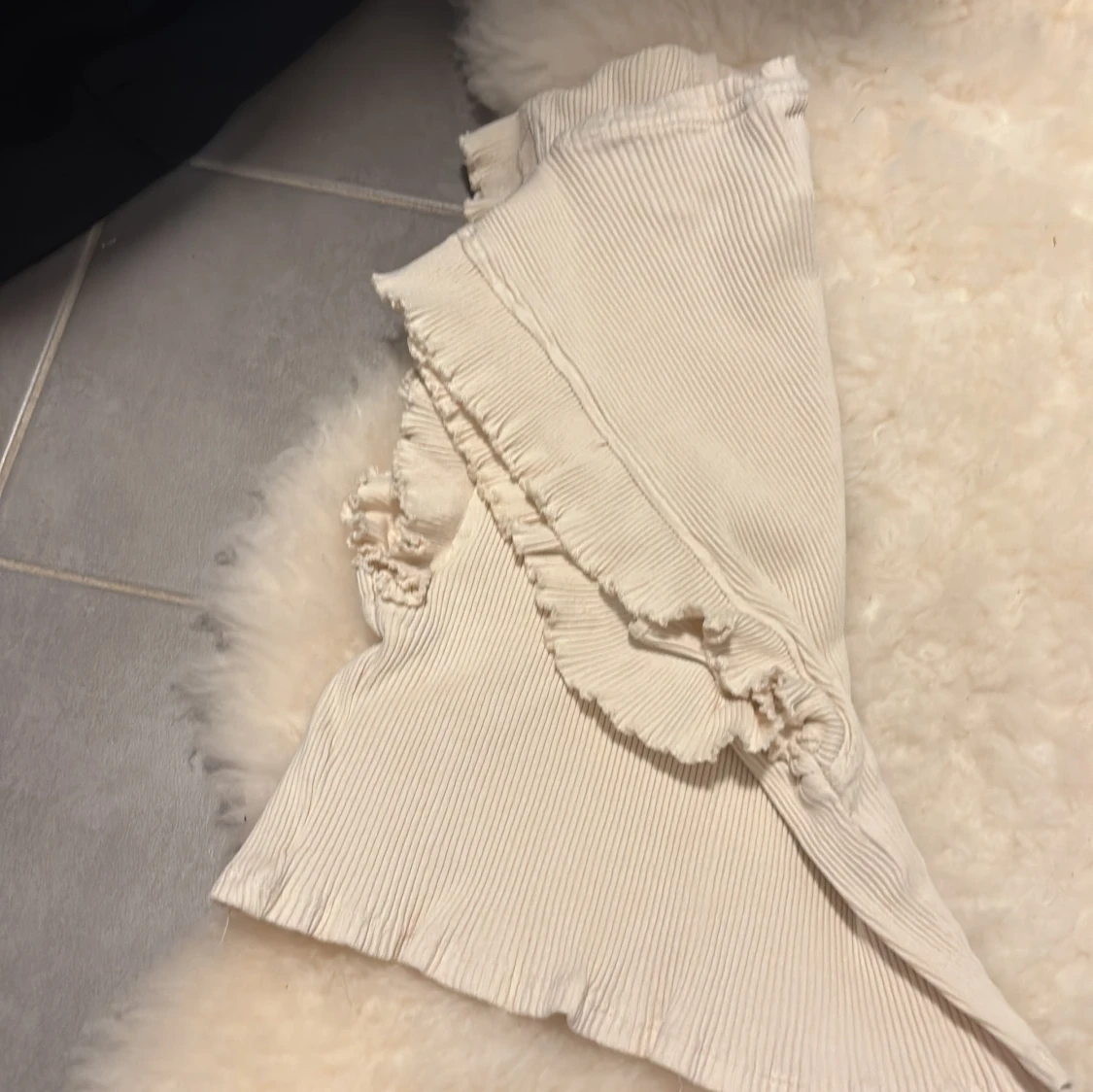 Supersöt ribbad topp från Zara i beige med volangdetaljer längs ärmhålen och nederkanten. Toppen är ärmlös och har en mjuk, stretchig känsla som gör den riktigt skön att bära. Perfekt för dig som gillar en stilren men ändå lekfull look.
