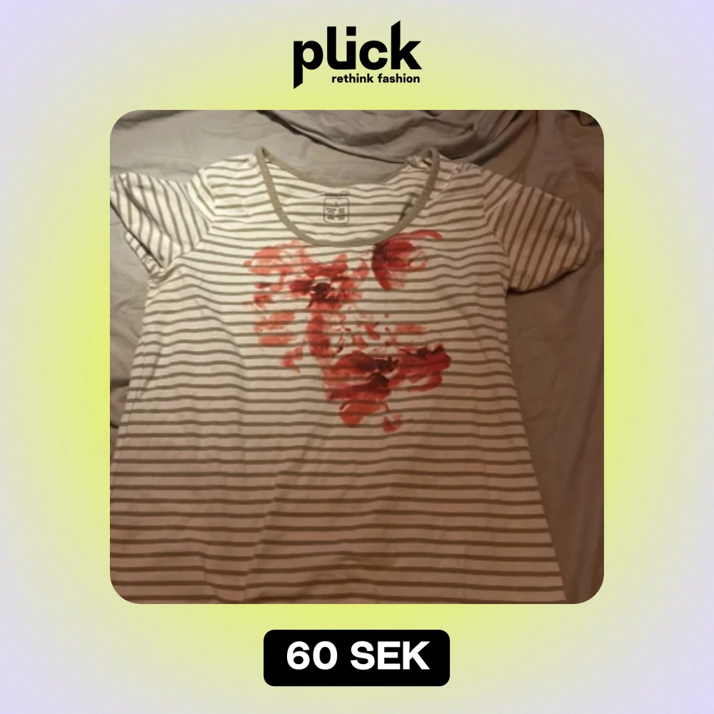 Säljer en randig t-shirt från Esmara i storlek L. Den har beige och vita ränder med ett rött blommönster på framsidan. T-shirten är kortärmad och gjord i ett mjukt bomullsmaterial. Perfekt för en avslappnad stil!