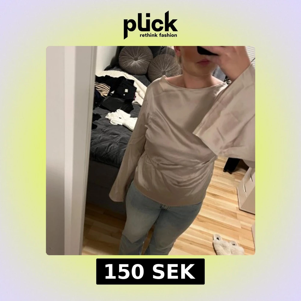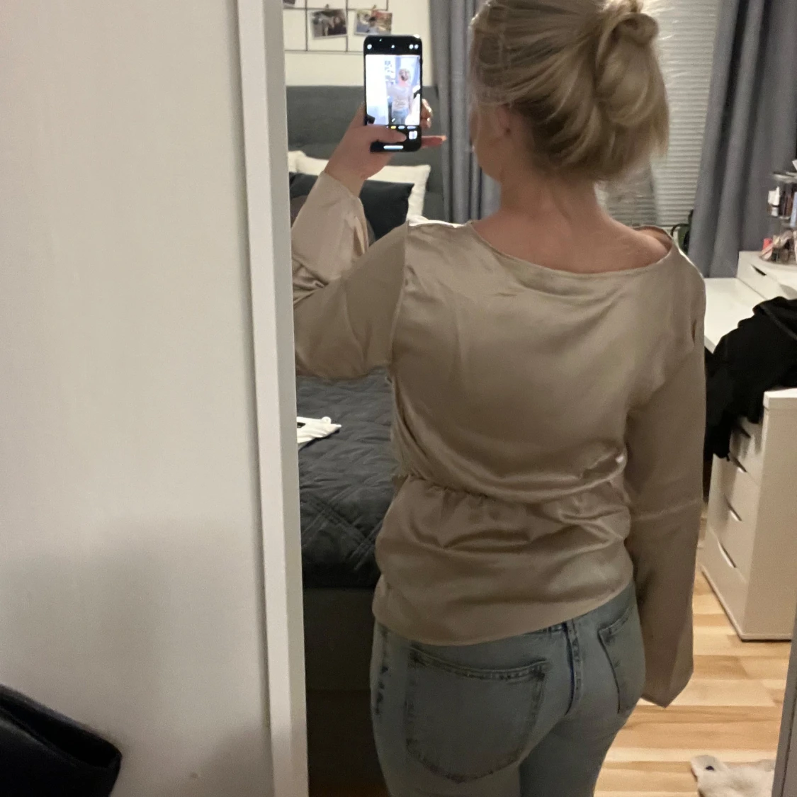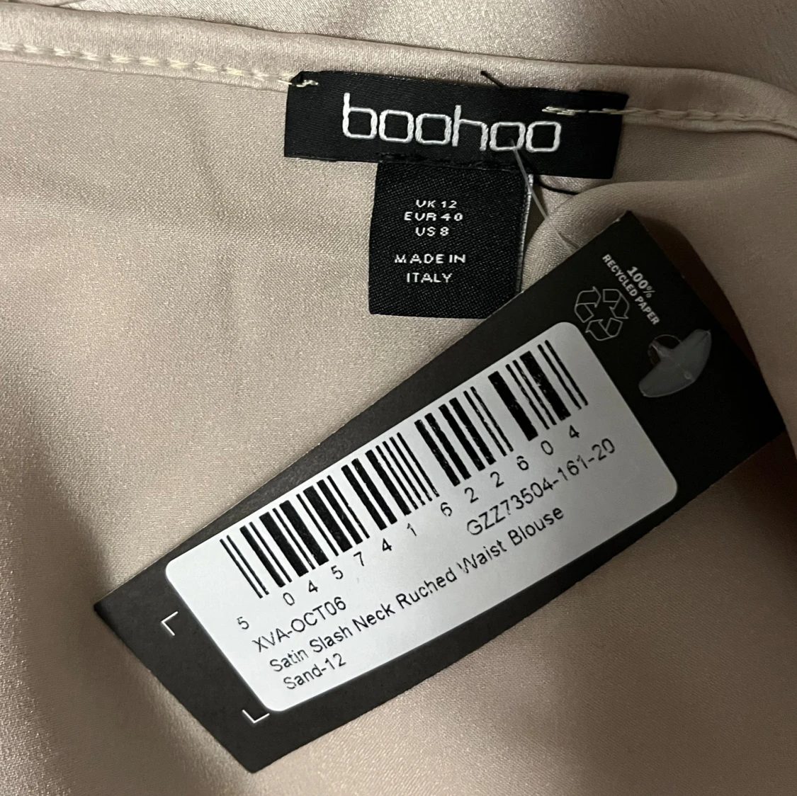 Snygg beige satintopp från Boohoo med lös passform och långa vida ärmar. Toppen har en slät, glansig yta och rynkade detaljer i midjan som ger en cool siluett. Båtringad halsringning och elegant fall. Perfekt för dig som gillar stilrena och trendiga plagg. Strl 40 men upplevs som 36/38. Endast testad.