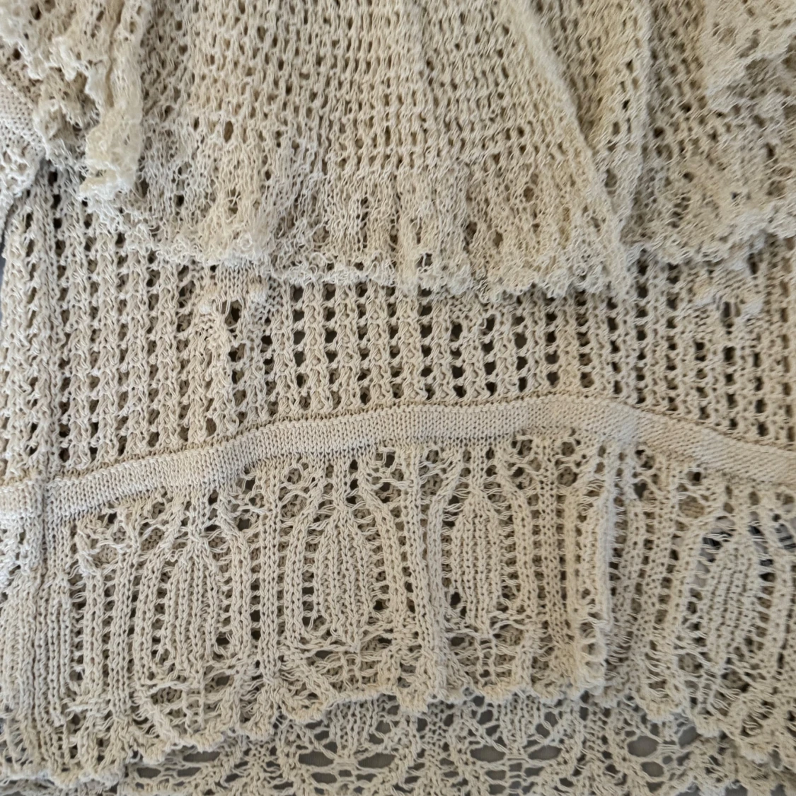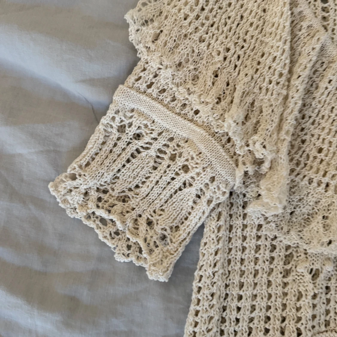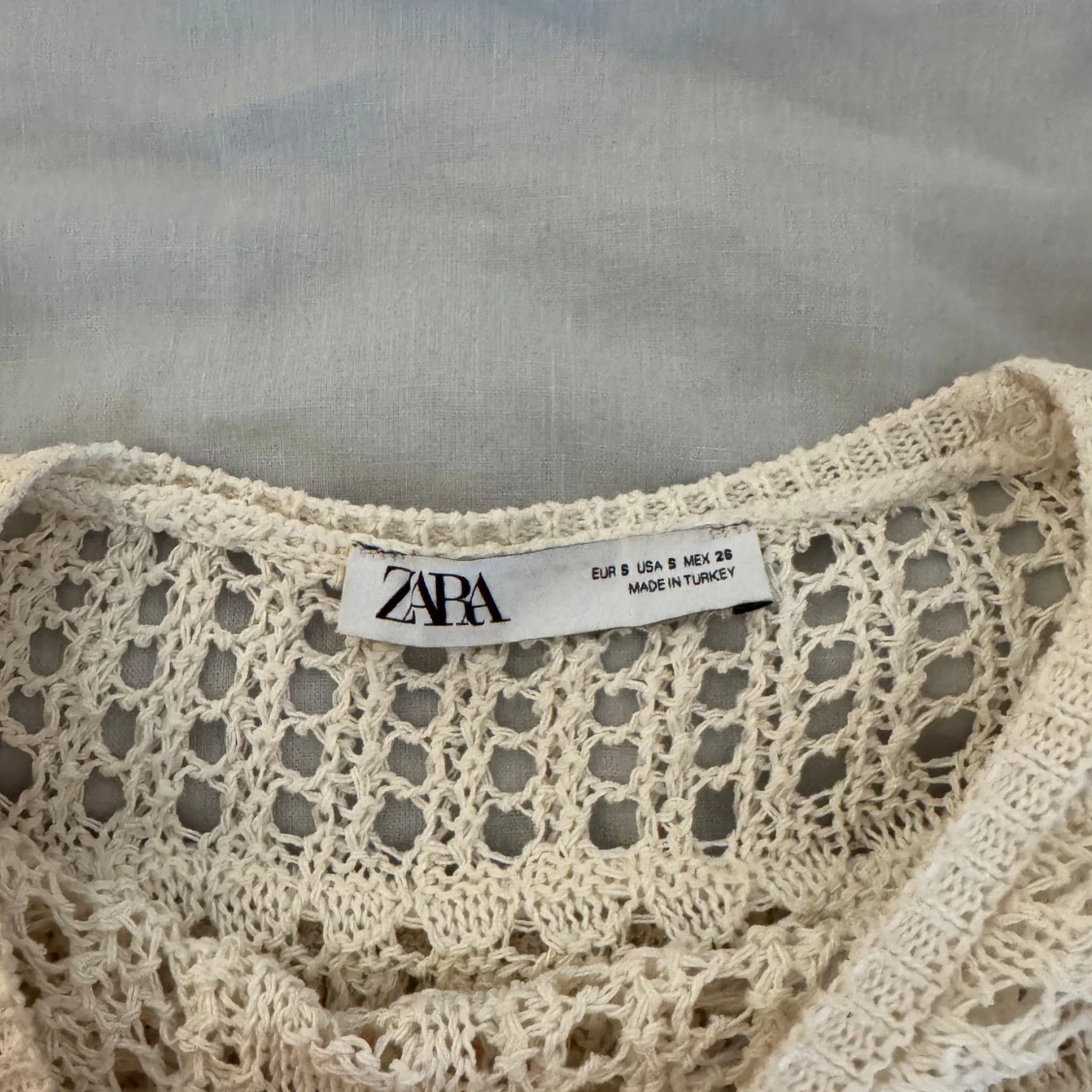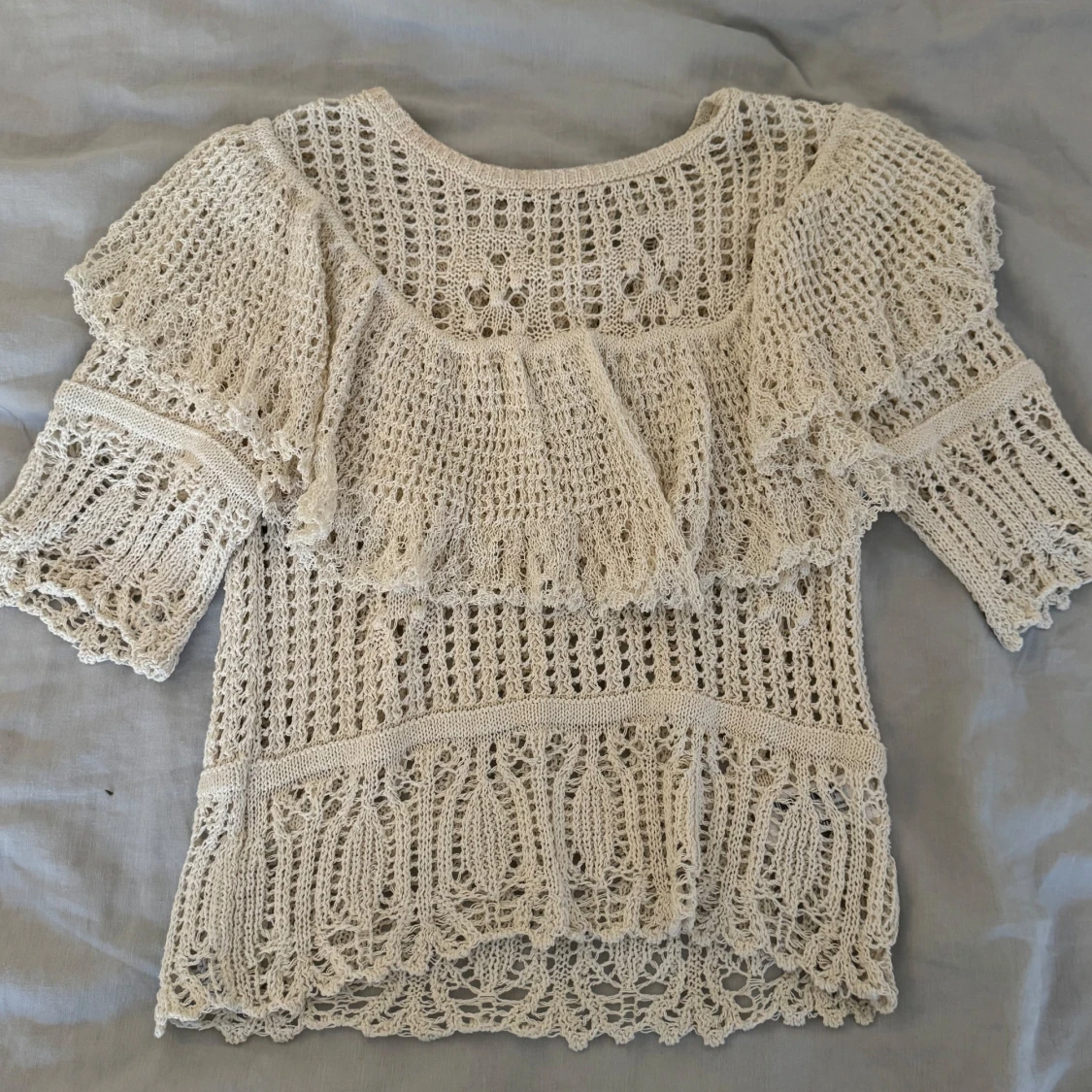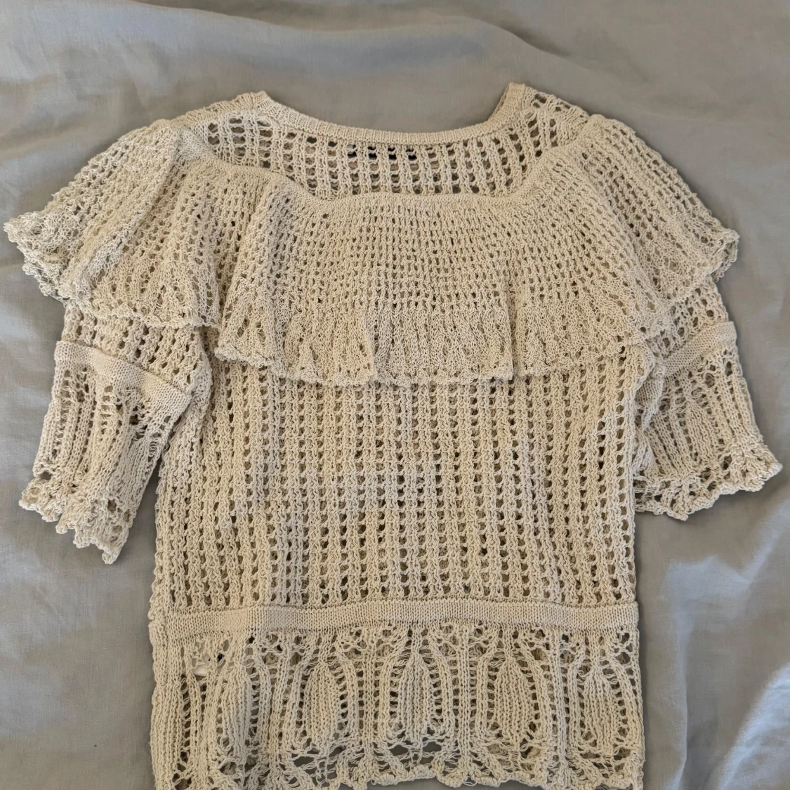 Supersöt beige spetsblus från Zara med korta ärmar och volangdetaljer. Otroligt fin och unik, passar till allt 🤍sparsamt använd! - läs min bio för mer info 💌