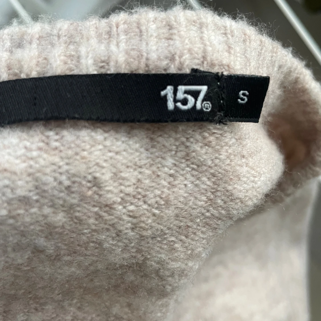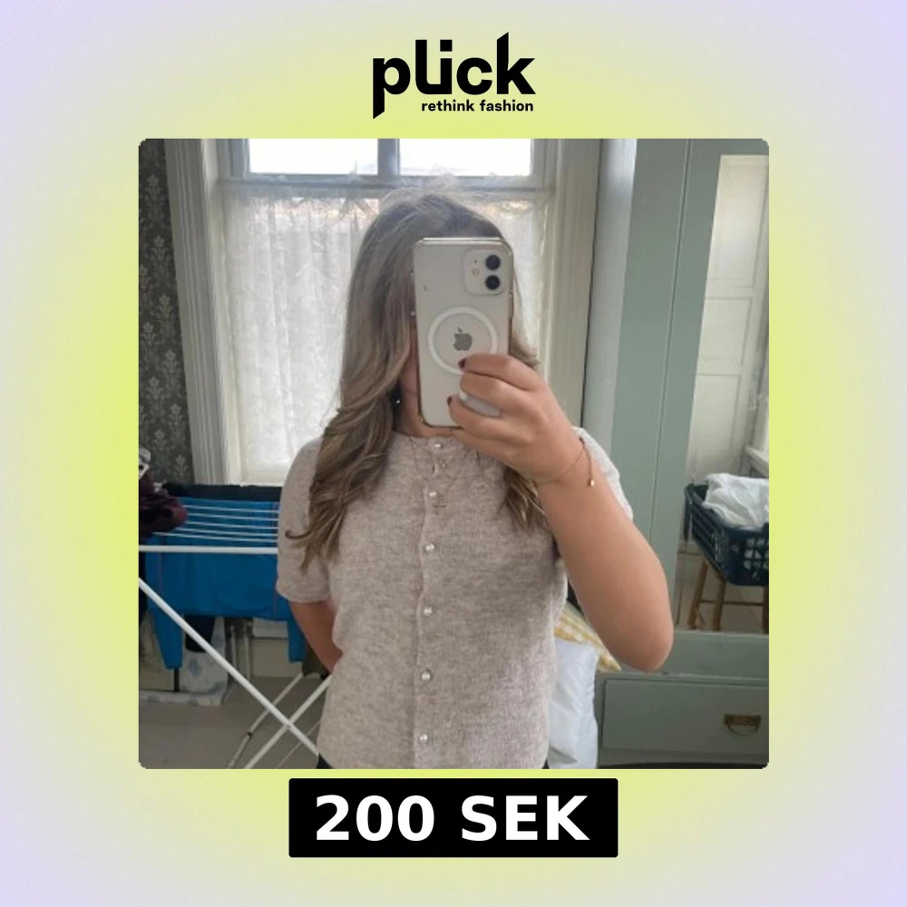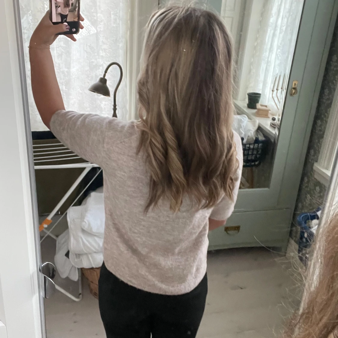 Supersöt beige stickad blus från 157 med korta ärmar och pärlknappar hela vägen framtill. Mjuk och mysig. Använt en gång