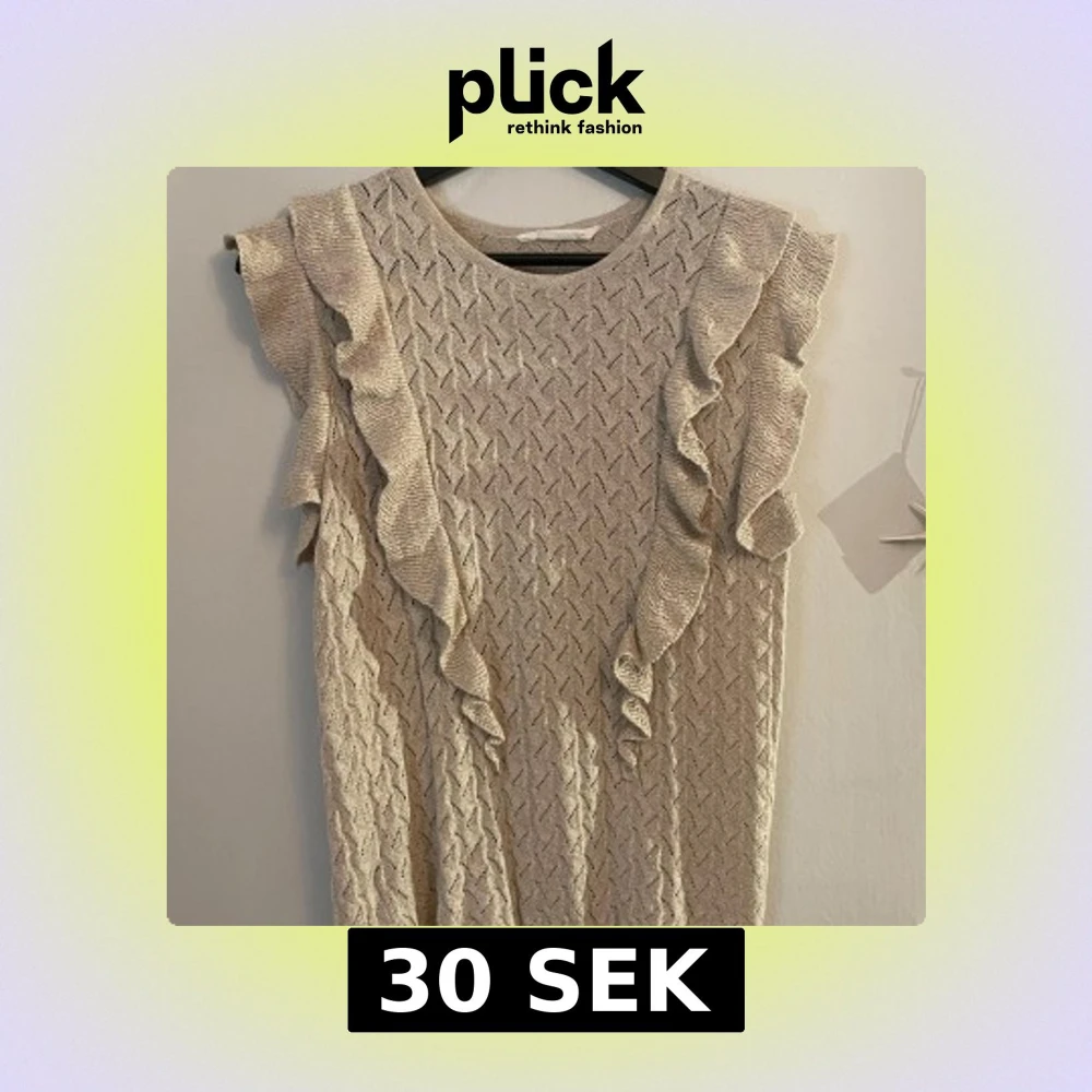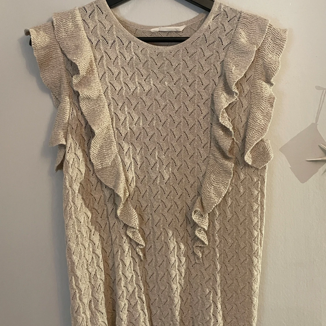 Supersöt beige stickad blus med volangdetaljer längs axlarna och ärmlös design. Guldglittrig! Storlek 164, skulle säga S!