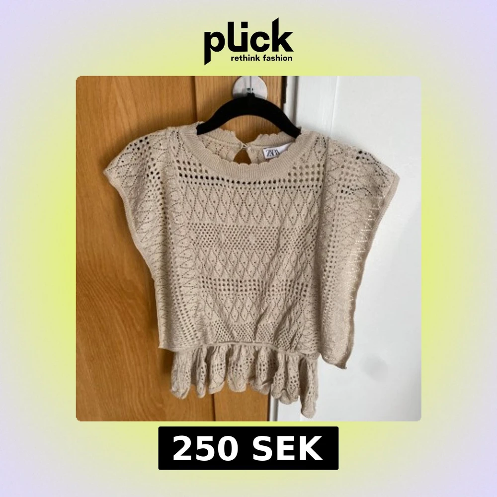 Säljer en beige stickad croppad topp från Zara med korta ärmar och volangdetalj nedtill, använd endast ett par gånger, jättefint skick! Toppen har ett fint hålmönster och knapp i nacken. Perfekt för att lyfta din outfit!