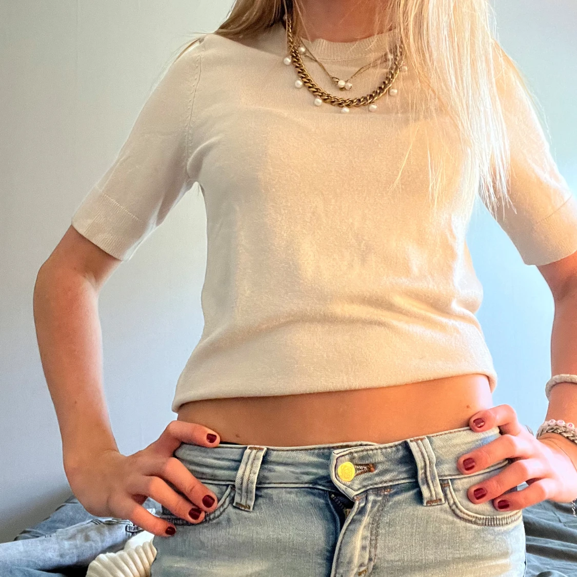Superfin beige stickad topp med korta ärmar och rund hals. Snygg, enkel och passar perfekt till jeans eller kjol. Mjuk och skön känsla, lätt att styla.