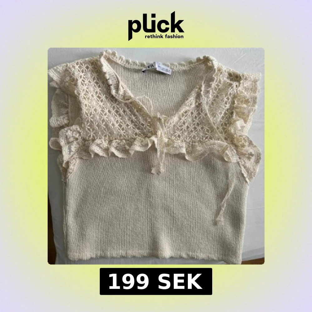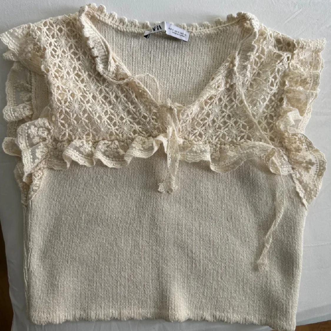 Supersöt croppad topp från Zara i beige stickat material med spetsdetaljer och volang längs axlar och halsringning. Toppen har knyt framtill och är ärmlös, perfekt för en somrig look. Obs inte mina bilder men fråga bara för fler! Nästan aldrig änväd 😊Storlek M men passar mig som brukar ha xs/s