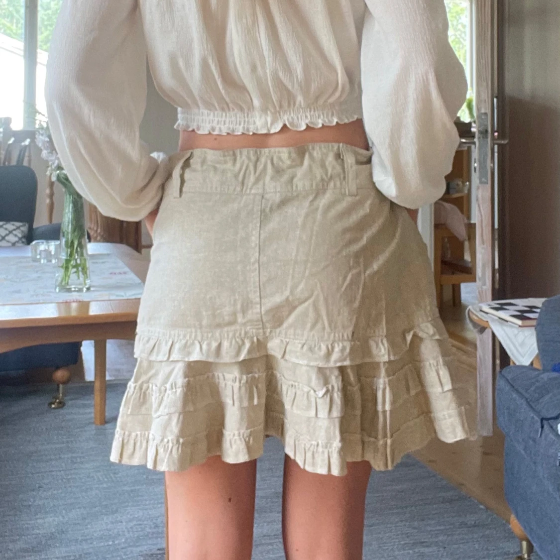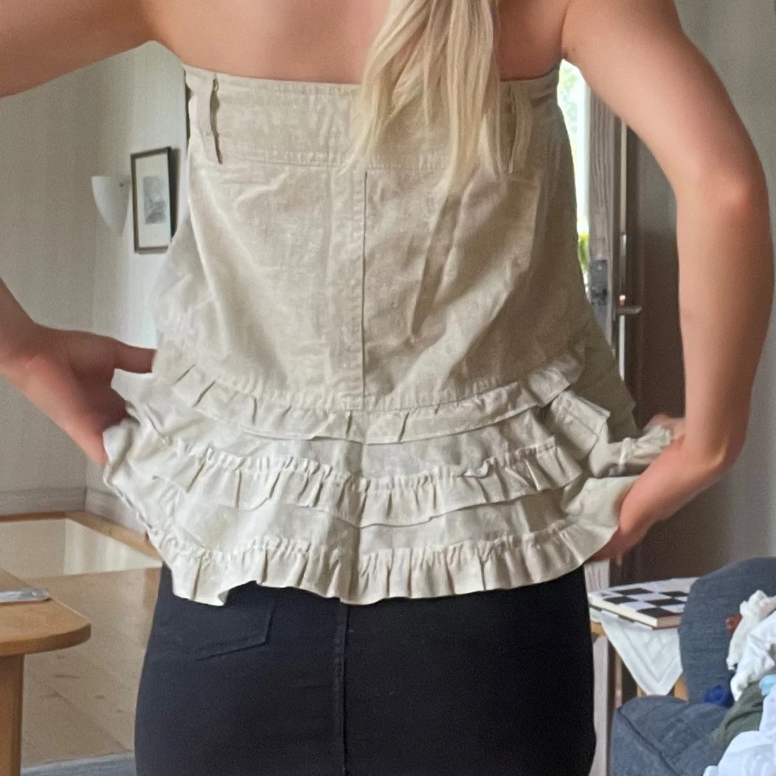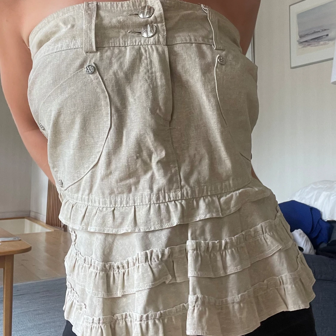 Supersöt beige tubtopp eller kjol beroende på hur man bär den med volanger och dekorativa fickor framtill. Toppen har dubbla knappar och resår upptill som jag satt in själv! Köpte på en fransk marknad för 30€ så vet inte vad det är för märke💓💓Kan skicka fler bilder privat!