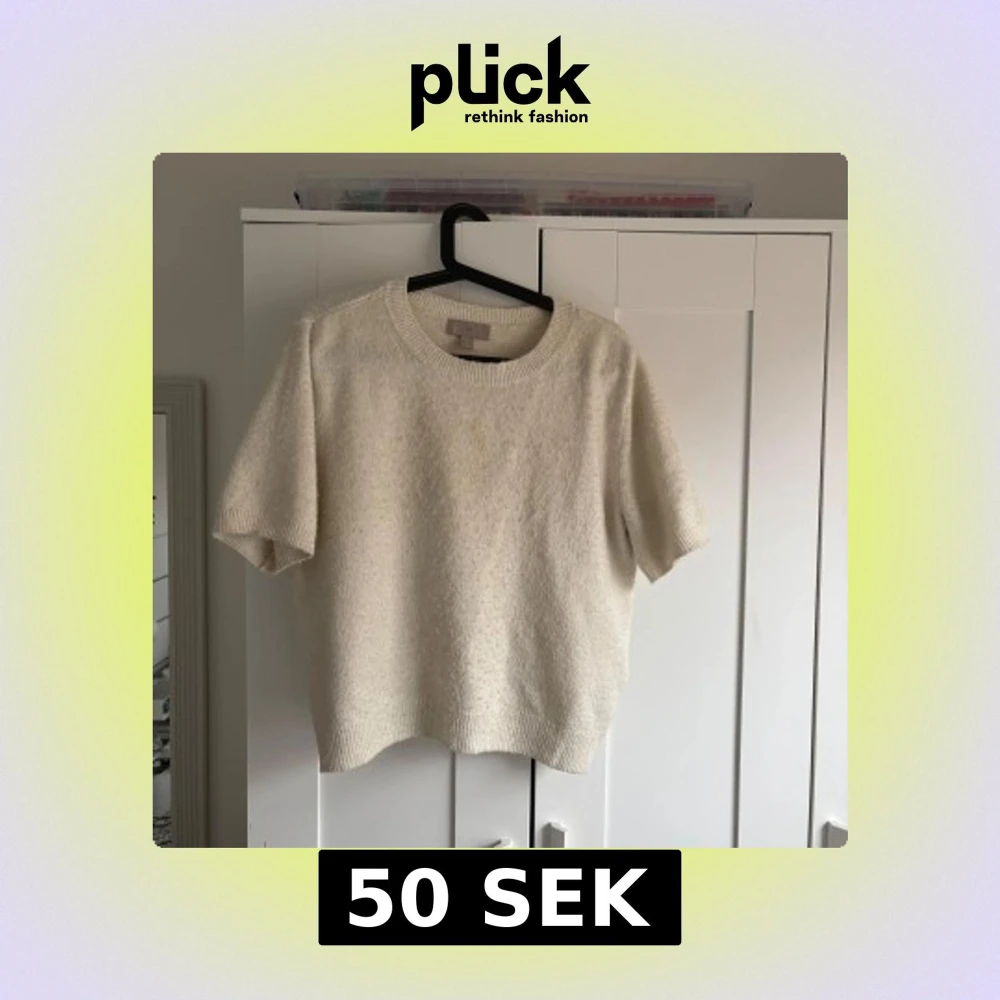 Säljer en söt stickad T-shirt från H&M. Tröjan har korta ärmar och en rund halsringning. Passar bra till både jeans och kjol. Är i storlek S men passar M
