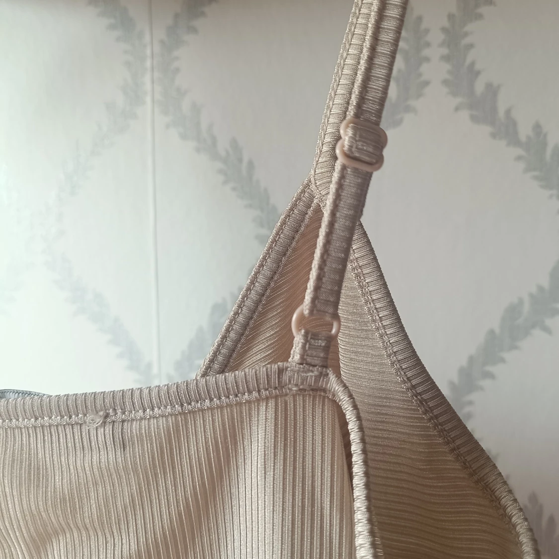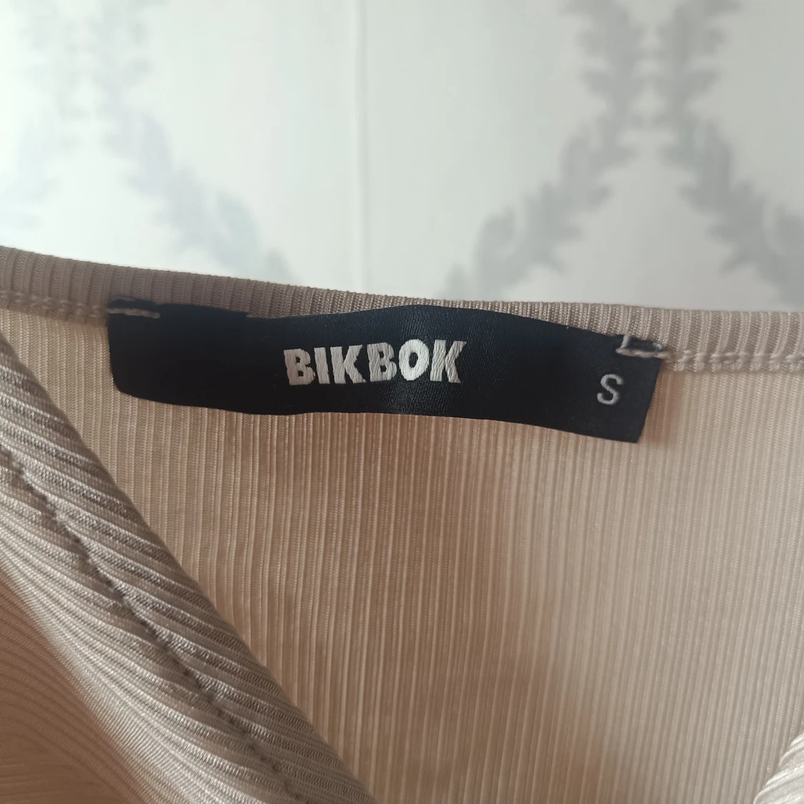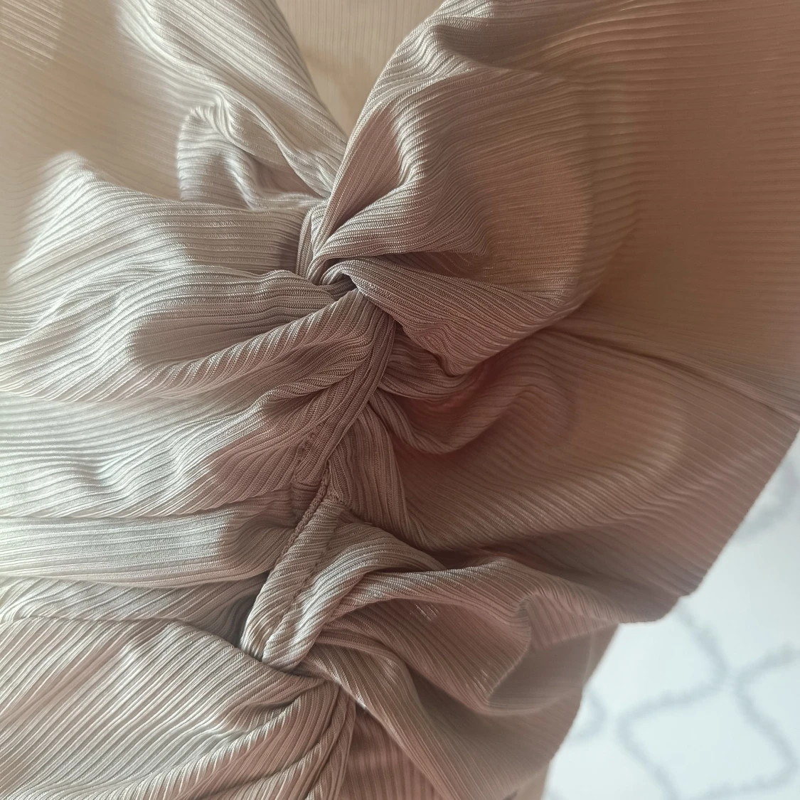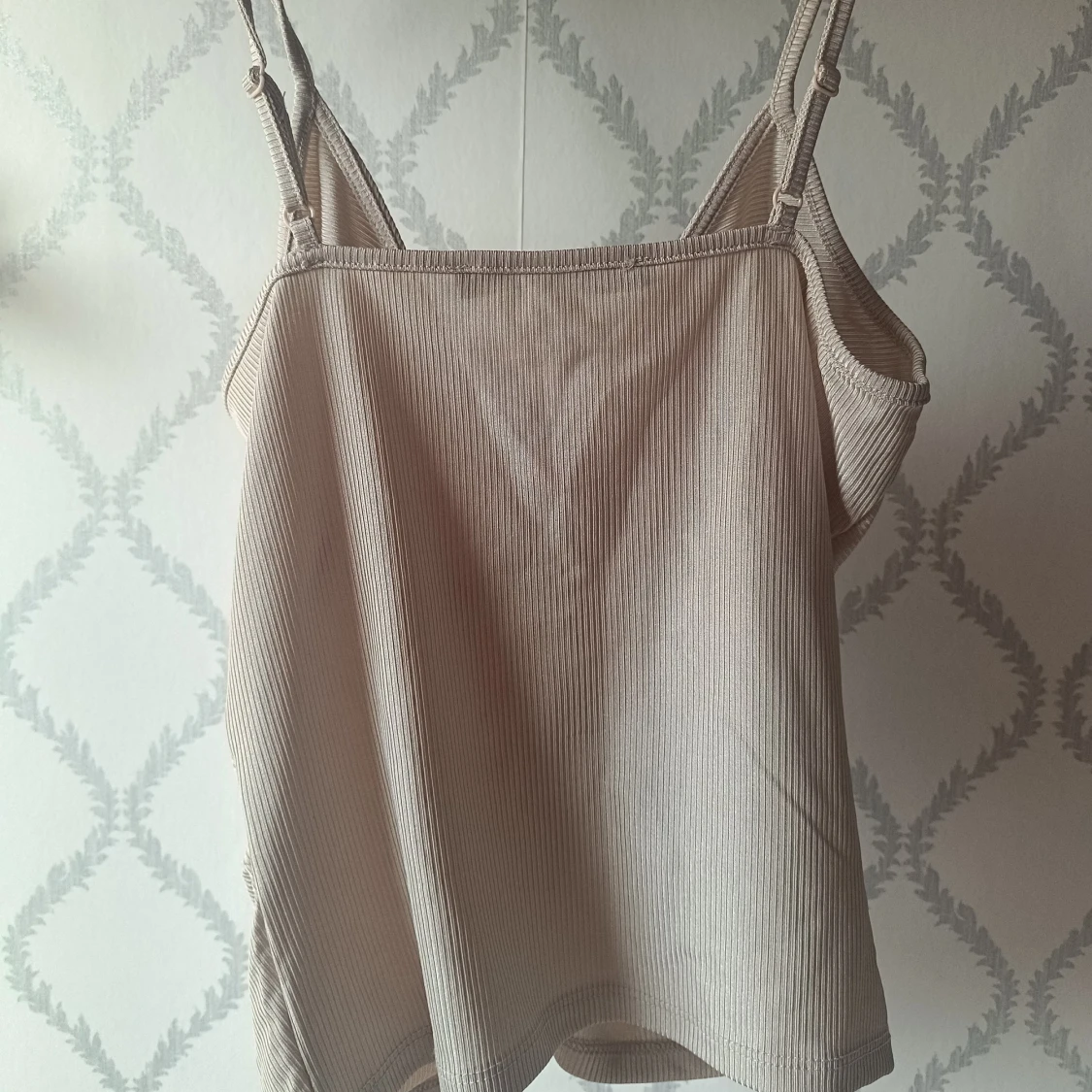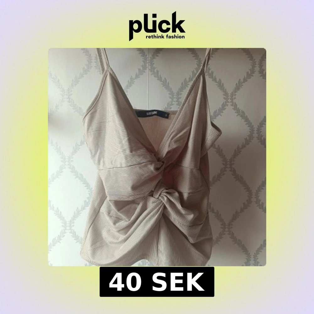Säljer en beige ribbad linnetopp från BikBok med smala justerbara axelband och snygg knutdetalj framtill. Toppen har en lätt glansig yta och är perfekt för varma dagar i sommar. Axelband som går att ändra. Använd ett fåtal gånger, 40 kr