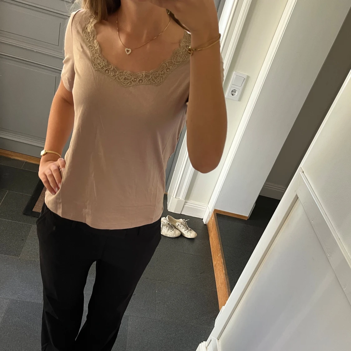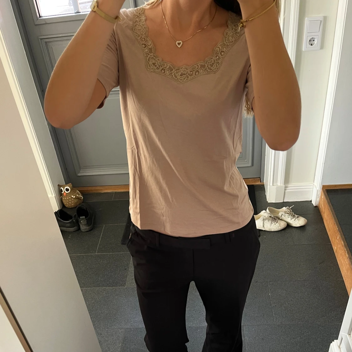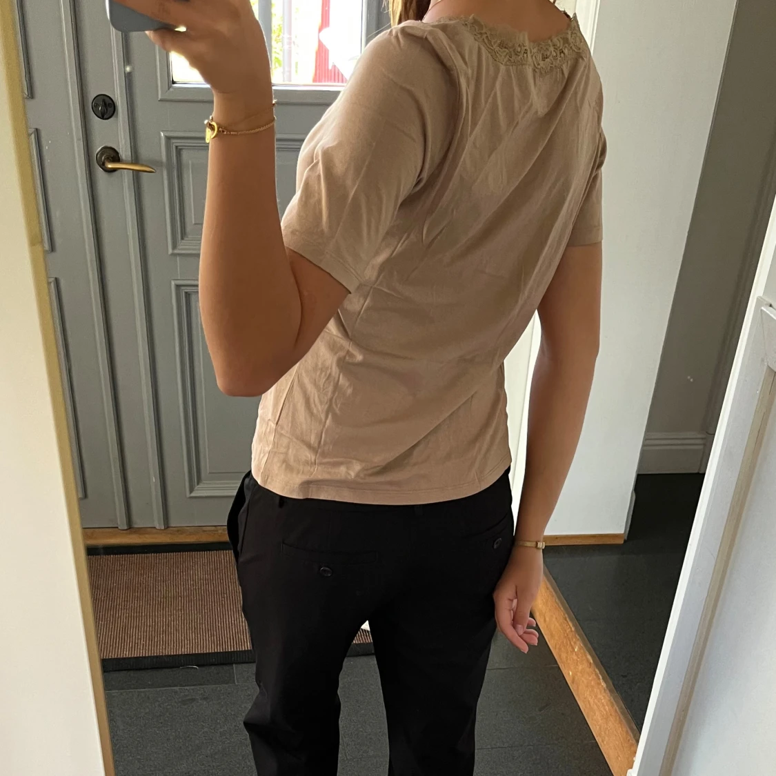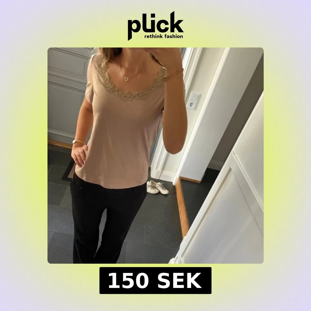 Beige/brun tröja med spets från Anne Weyburn i storlek 38, passar S och M. Fint skick. Använd gärna köp nu!