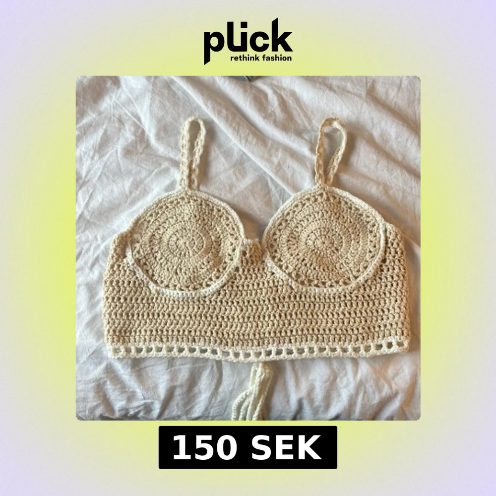 Säljer en snygg beige virkad topp med smala axelband och snörning i ryggen. Toppen har en unik design med cirkulära mönster framtill och är perfekt för sommardagar. Då den har ett inner tyg vid brösten kan den användas utan bh💕Den är croppad och ger en bohemisk vibe💕 knappt använd därför i väldigt bra skick! Passar xs-s.