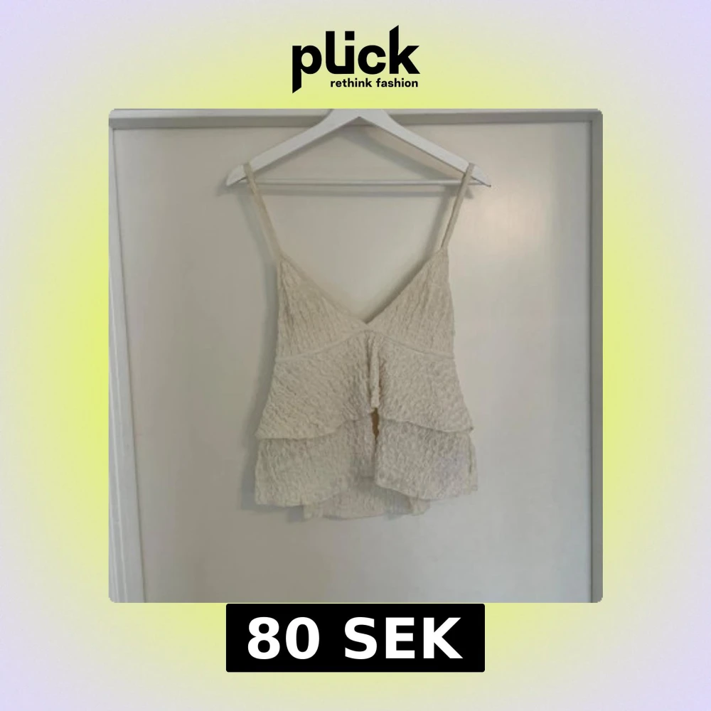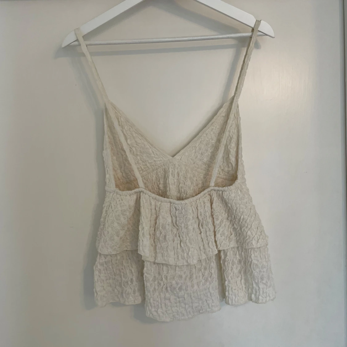 Säljer en söt beige linnetopp med volanger och smala axelband. Toppen har en lätt skrynklig struktur och v-ringad halsringning både fram och bak. Perfekt för varma dagar och enkel att matcha med jeans eller kjol.