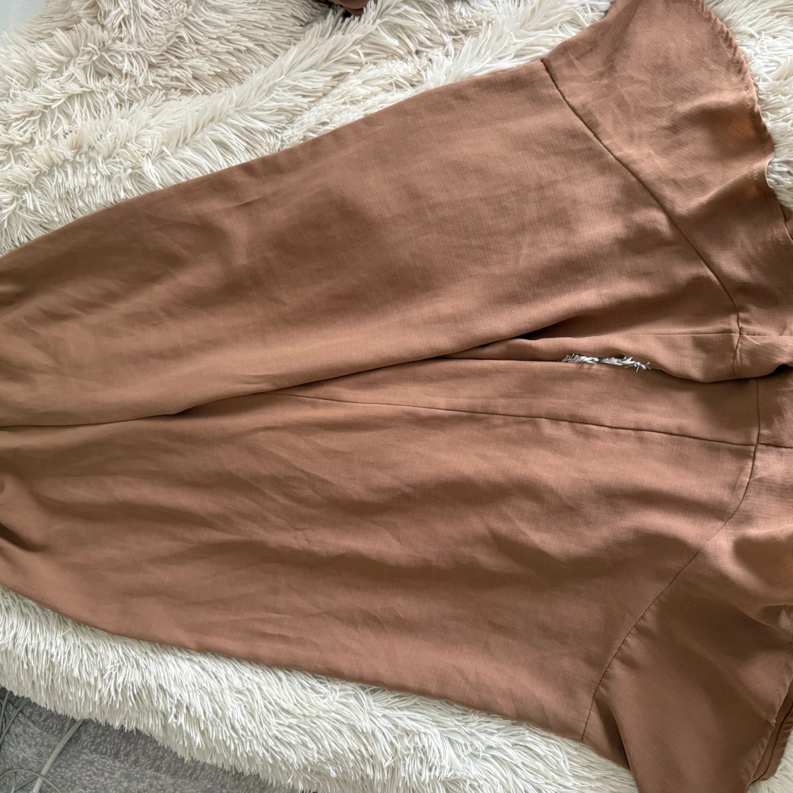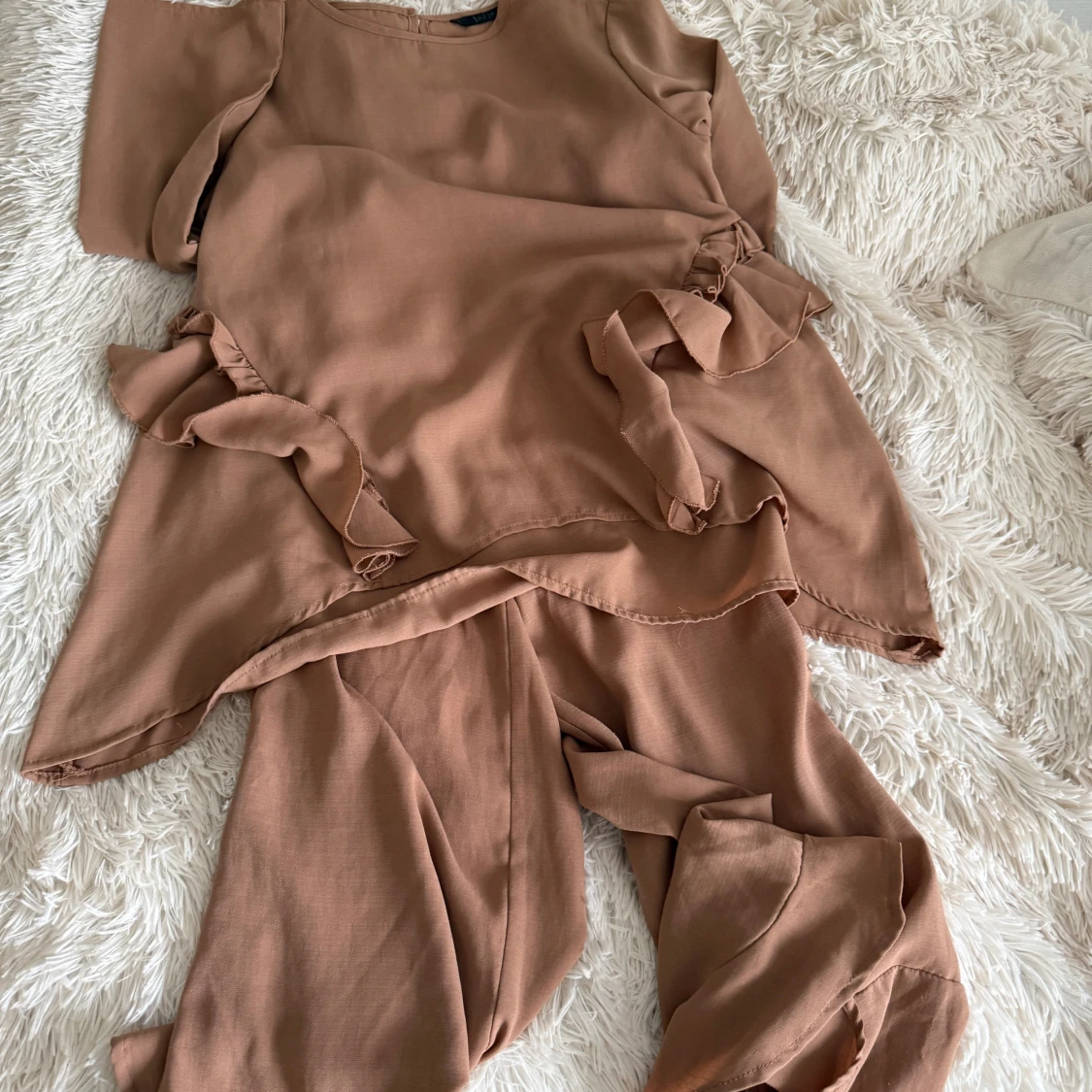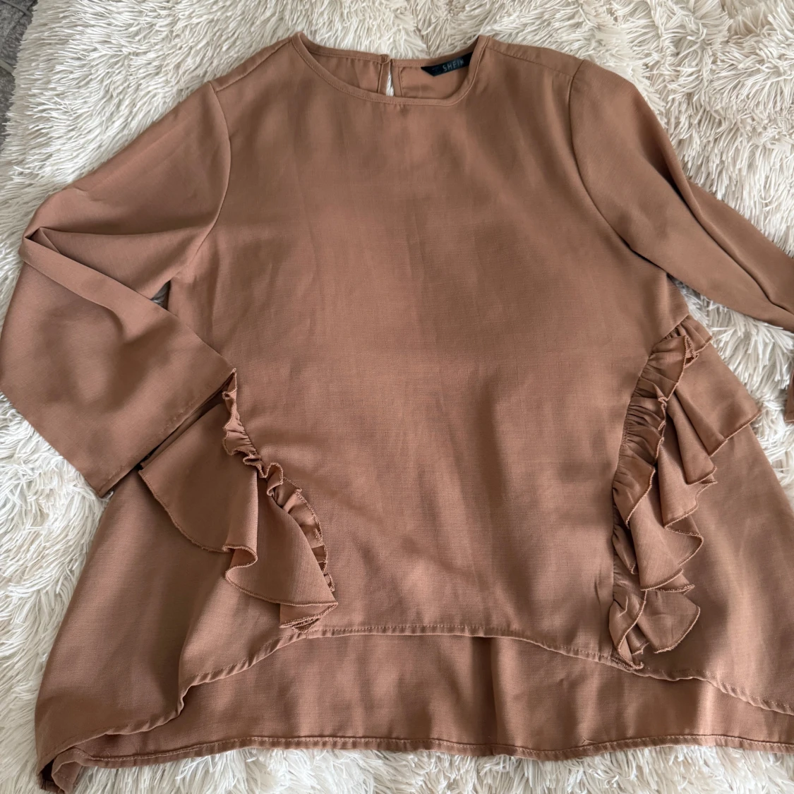 Supersöt brun sett från SHEIN i storlek XS. Blusen har långa ärmar och snygga volangdetaljer längs sidorna. Den är tillverkad i ett mjukt, lätt material och har en avslappnad passform med rund halsringning. Perfekt för dig som gillar en stilren men ändå lekfull look.